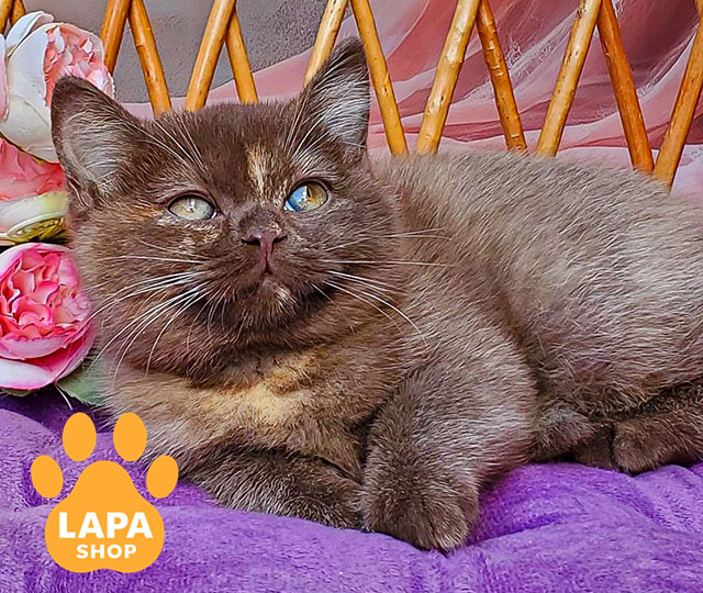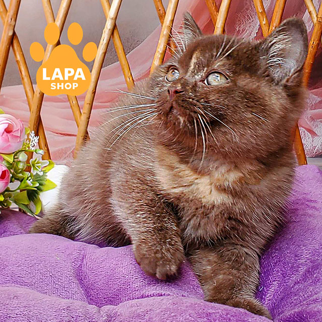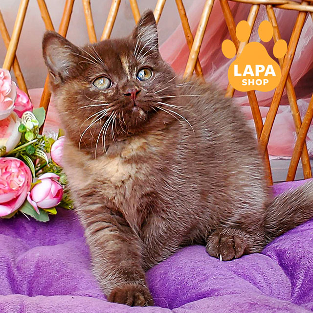 Витончена дівчинка породи британська короткошерста у рідкісному шоколадно-черепаховому забарвленні. Її шубка поєднує теплі відтінки, створюючи неповторний візерунок, який надає їй особливого шарму. Маленька красуня виглядає дуже ніжно та привабливо, привертаючи увагу з першого погляду.