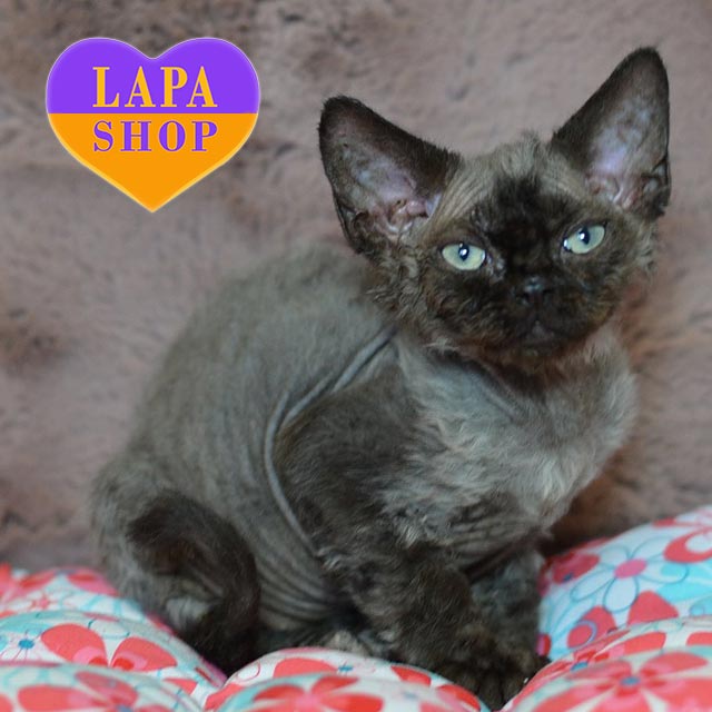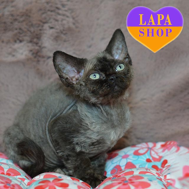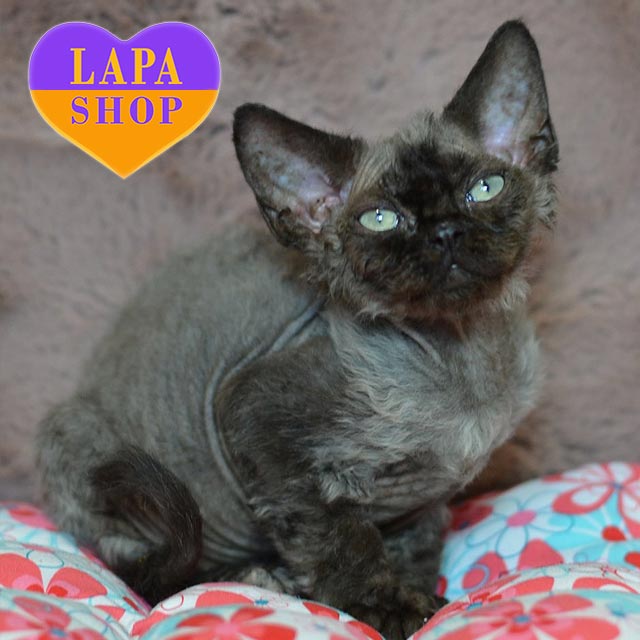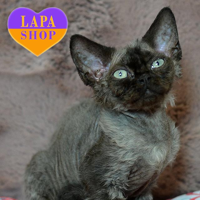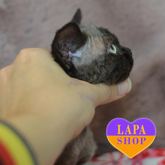 Хлопчик породи девон-рексу глибокому чорному забарвленні. Хвиляста шерсть глибокого чорного кольору, великі вушка та проникливий погляд надають йому особливого харму.