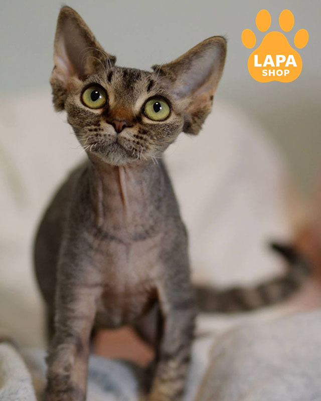 Kate привертає увагу ефектним чорним плямистим забарвленням, яке виглядає контрастно та дуже виразно на її хвилястій шерсті. Незвичайна текстура хутра та великі вушка надають їй яскравої породної харизми.