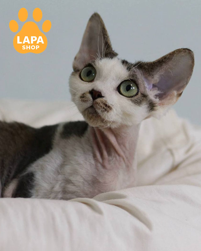 Lewis привертає увагу ефектним чорним таббі арлекін забарвленням із виразним контрастом та незвичайним візерунком. Його хвиляста шерсть, великі вушка та проникливий погляд підкреслюють породну витонченість і особливий шарм.