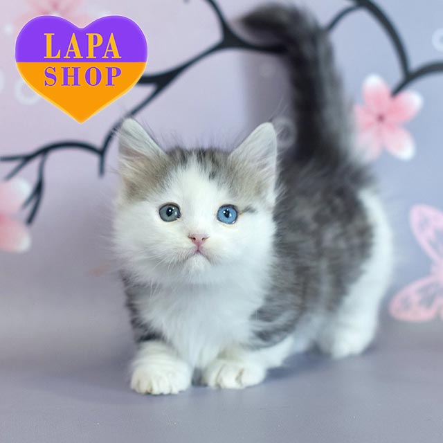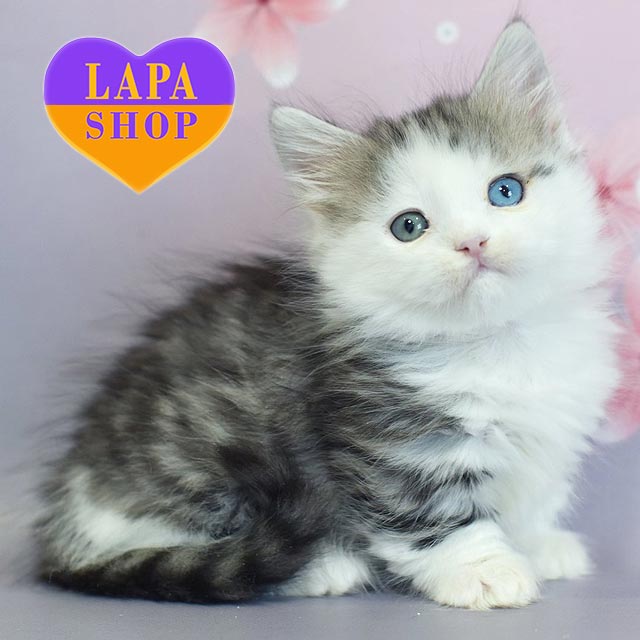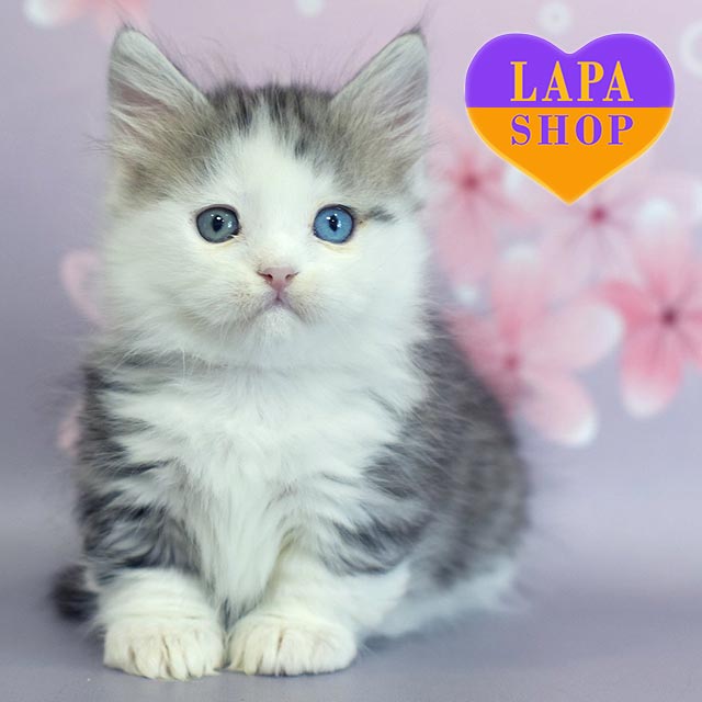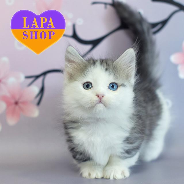 Манчкін Junona – чарівна коротколапа дівчинка з надзвичайно гарними оченятами. Її сріблясте плямисте біколорне забарвлення поєднується з дивовижними різнокольоровими очима. А пухнаста шерсть і коротенькі лапки додають їй особливої привабливості.