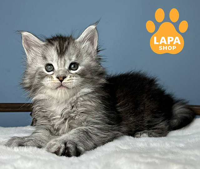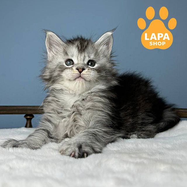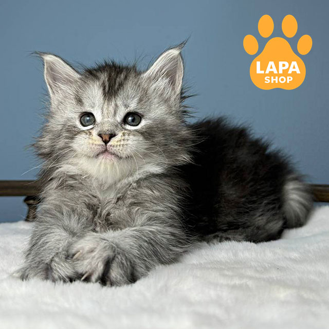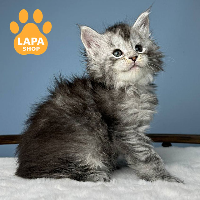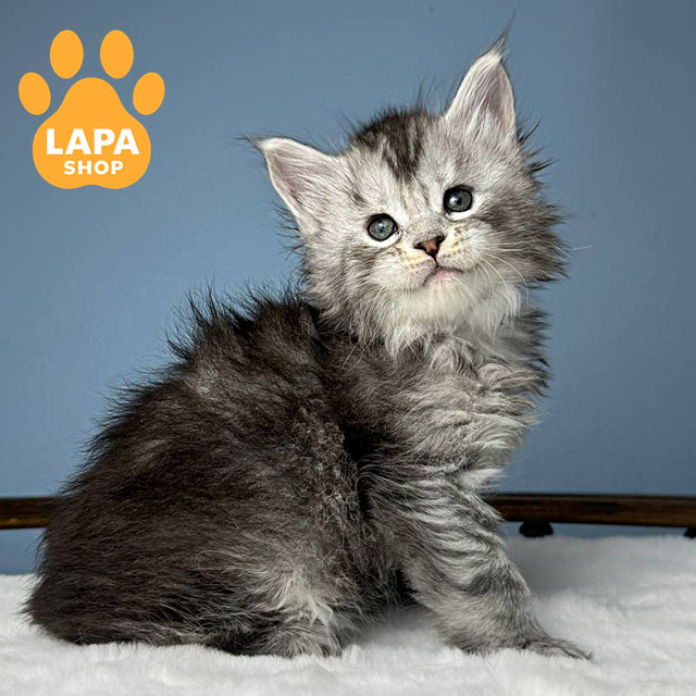 Кішечка з витонченим чорним сріблястим тикованим забарвленням (ns 25), яке виглядає благородно та елегантно. Її пухнаста шубка додає образу особливого шарму, а акуратні риси підкреслюють породний тип.