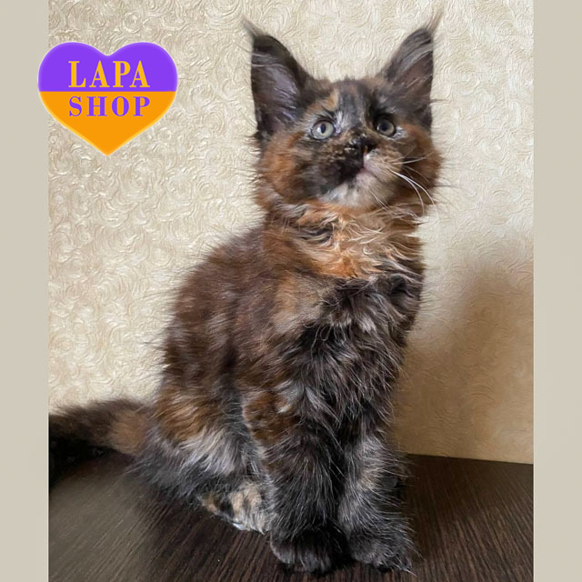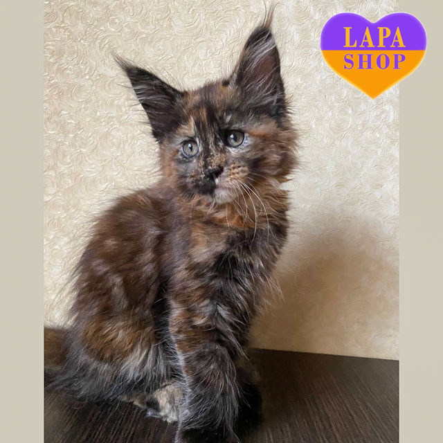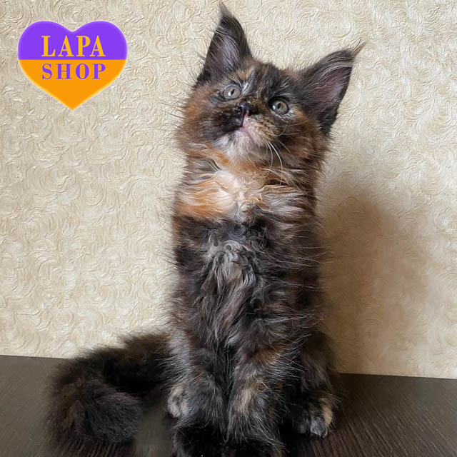 Chelsea — чарівна мейн-кун дівчинка з розкішним чорним черепаховим (f) забарвленням, що робить її справжнім витвором природи. Її велична постава, пухнастий хвіст і виразні очі підкорюють з першого погляду. Вона виросте в елегантну красуню, яка прикрасить будь-який дім своєю присутністю.