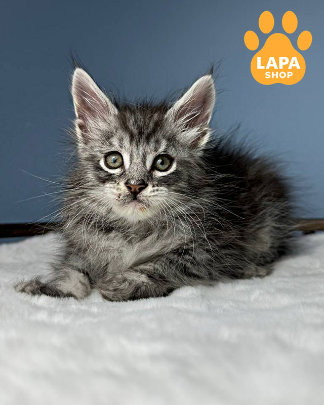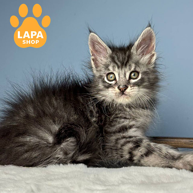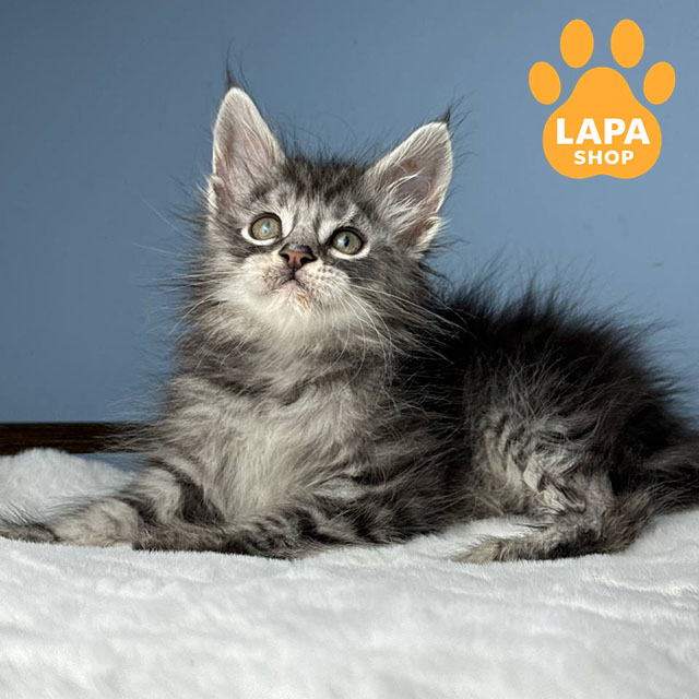 Цей гарний котиук породи мейн кун з чорним сріблястим плямистим забарвленням (ns 24), яке надає його густій шерсті виразного і благородного вигляду.
