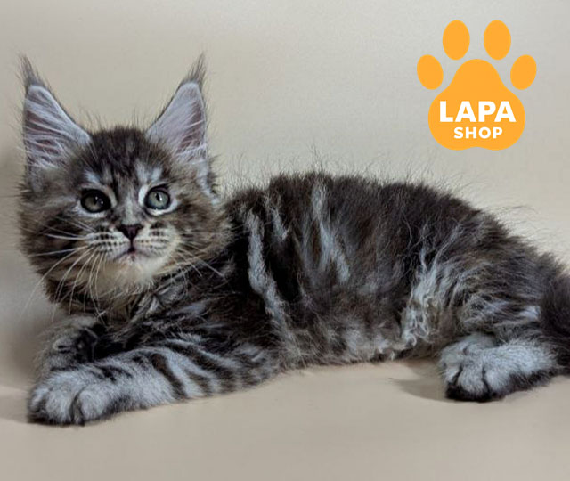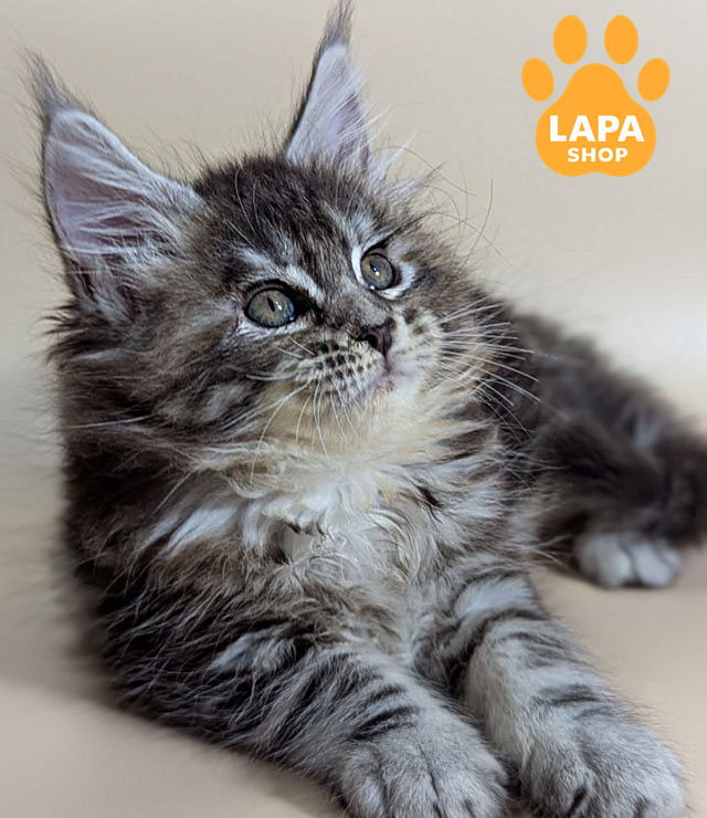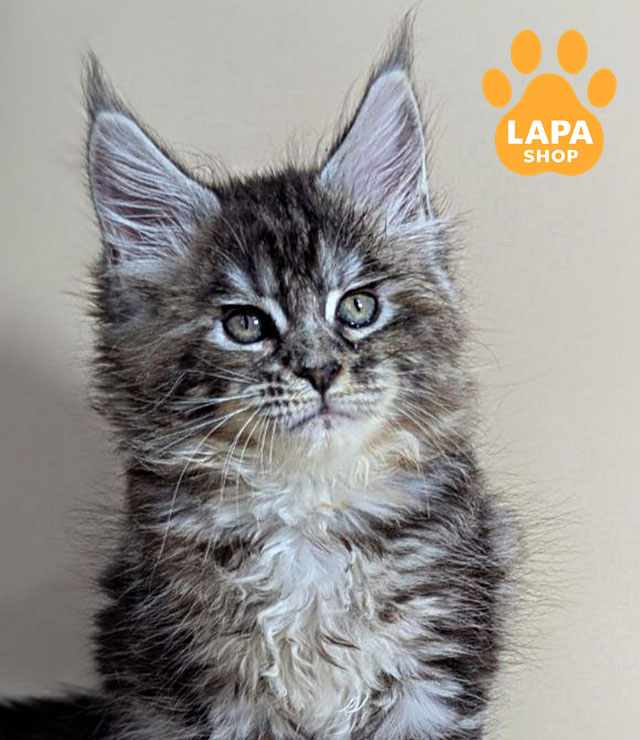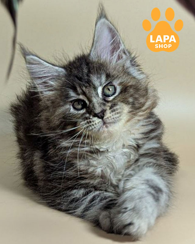 Flora — ефектна дівчинка породи мейн кун із розкішним черепаховим сріблястим тикованим забарвленням (fs 25). Її шубка виглядає яскраво та благородно, з гарним срібним відливом, що підкреслює породний тип.