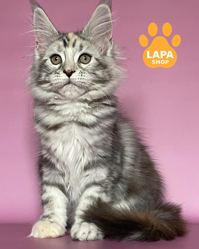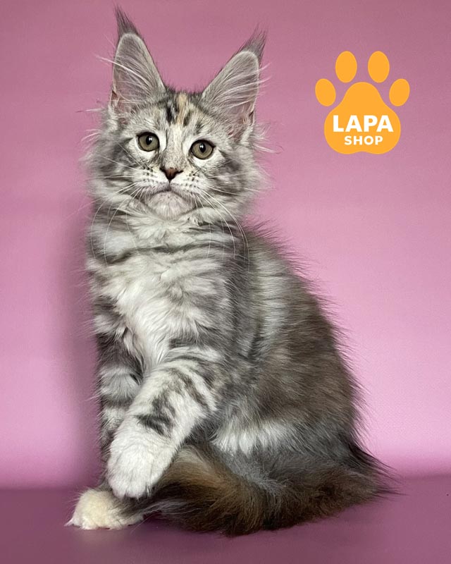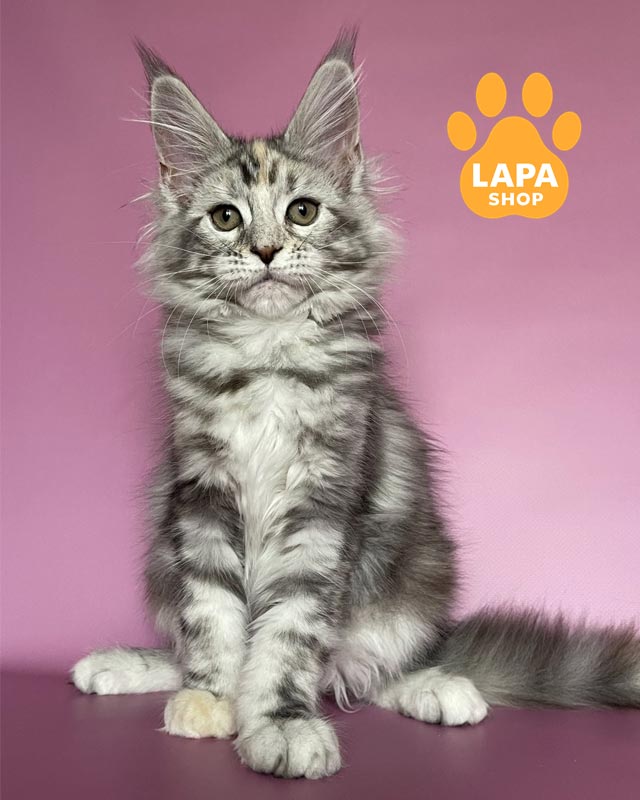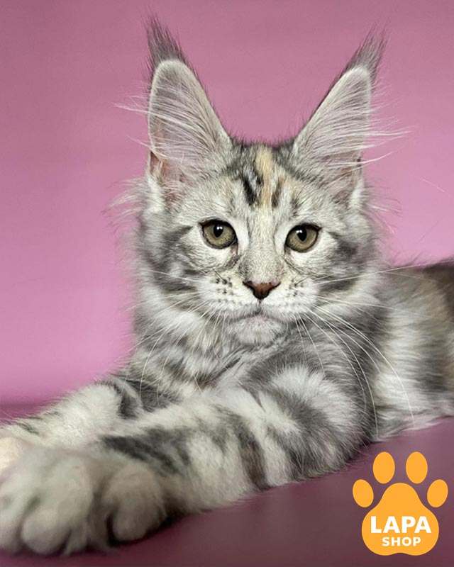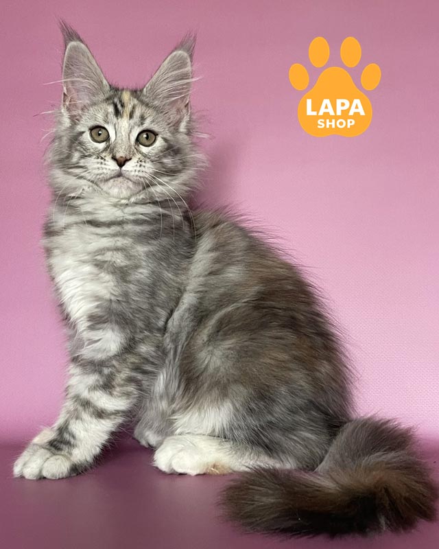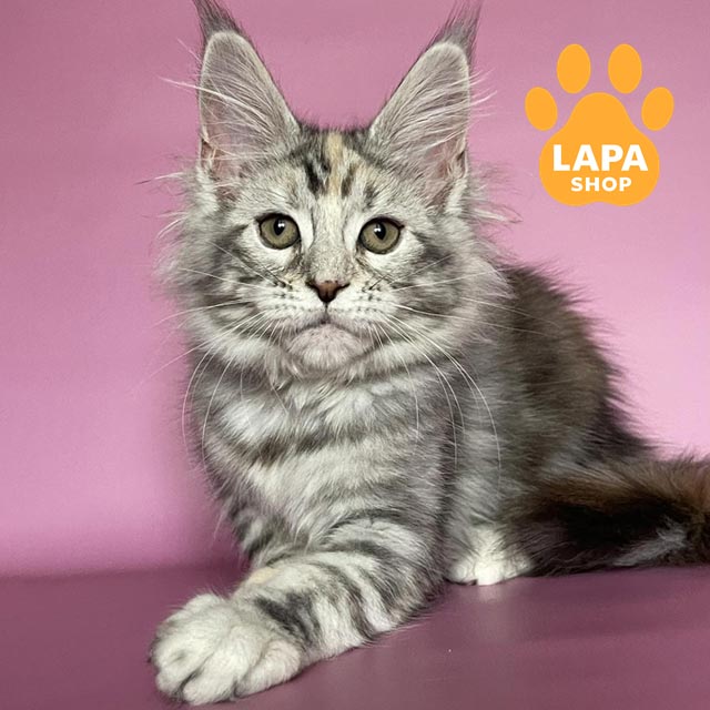 Gloria — чудова кішечка мейн-кун з розкішним черепаховим сріблястим мармуровим забарвленням на густому хутрі.