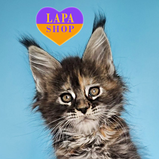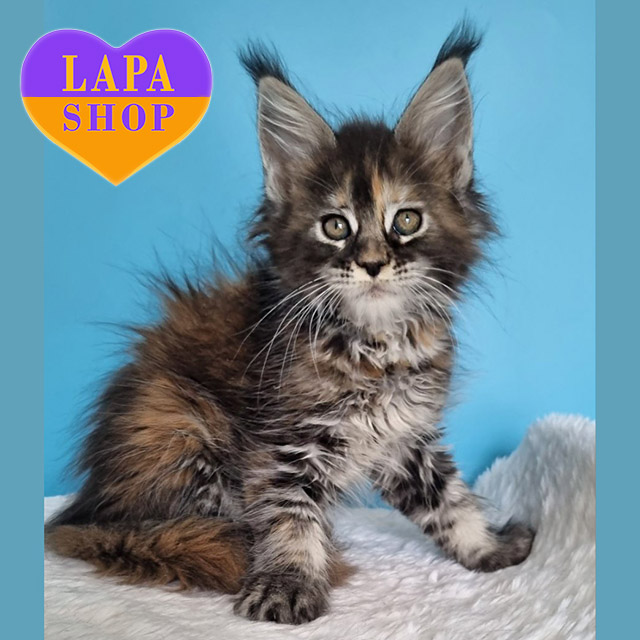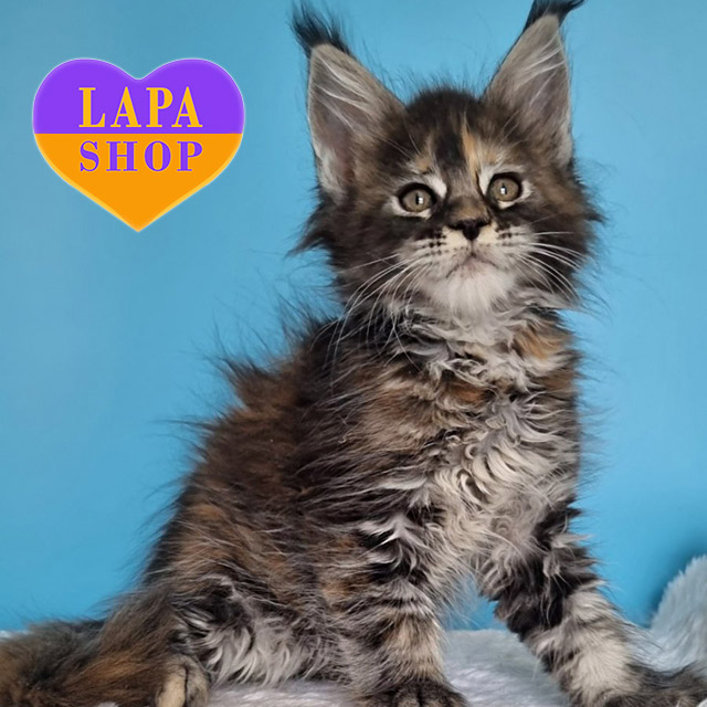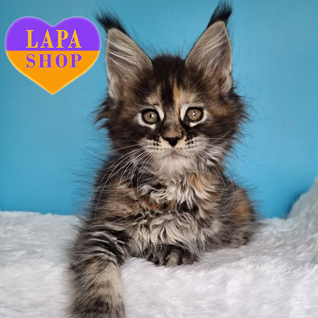 Gloria — вишукана мейн-кун кішечка з черепаховим сріблястим мармуровим забарвленням. Її розкішна зовнішність та ніжний вигляд зроблять її ідеальним компаньйоном для вашої родини.