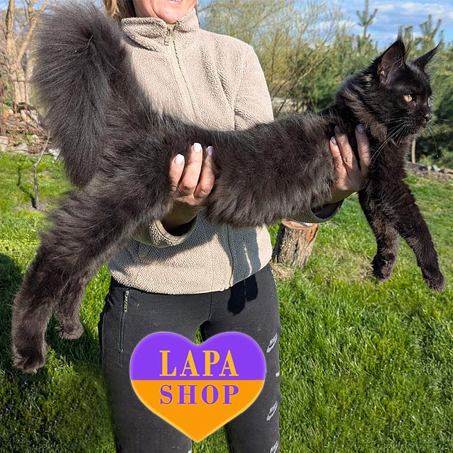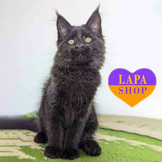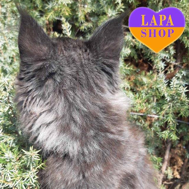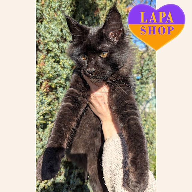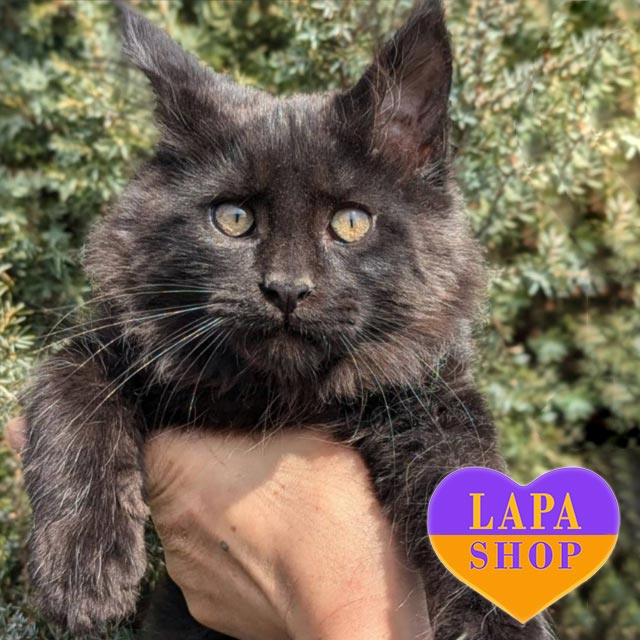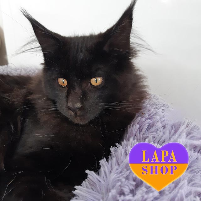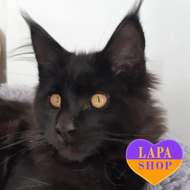Амальтея – кішечка породи мейн-кун. Її розкішна чорна шерсть має глибокий блакитний підшерсток, що створює ефект загадкового сяйва. Виразні очі випромінюють мудрість, а витончений силует підкреслює шляхетність цієї красуні.