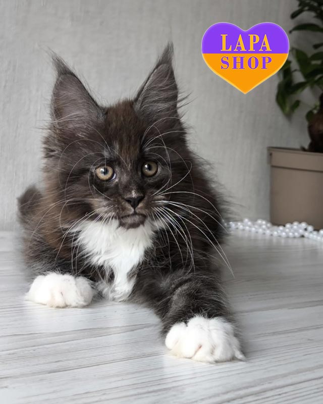 Chantal — димна принцеса мейн-кун. Ця чарівна дівчинка з рідкісним димним біколором (ns 03) має вишукану зовнішність і м’який характер. Її срібляста шубка з білими відмітинами ніби створена для обіймів.