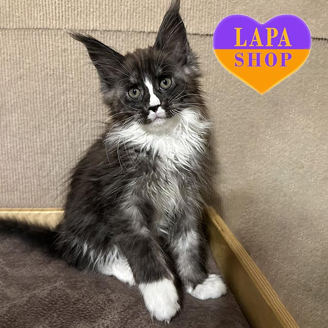 Feodosia – елегантна кішечка мейн-кун з вишуканим чорним димним забарвленням і білими відмітинами.