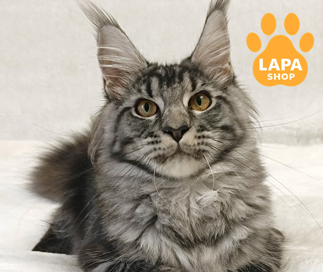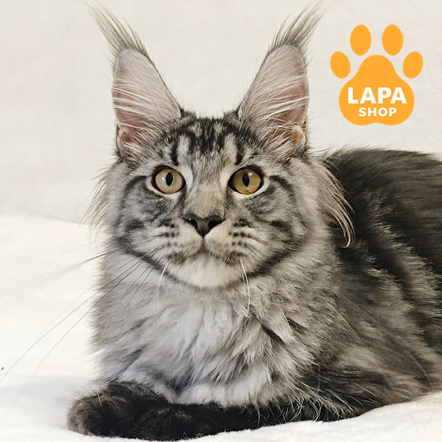 Jasmin — чарівна дівчинка породи мейн-кун із вражаючим сріблястим мармуровим забарвленням, що виглядає, немов витвір мистецтва.