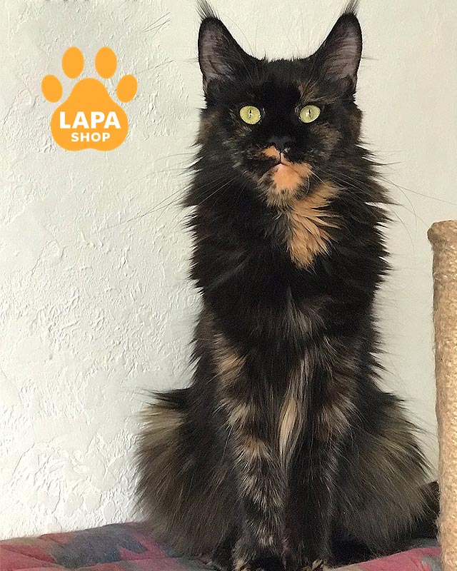 Kiowa – яскрава черепахова красуня породи мейн-кун із чорним черепаховим забарвленням, що поєднує насичені темні та вогняні руді відтінки.