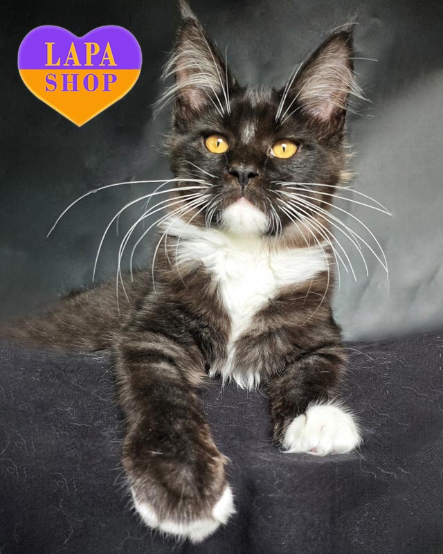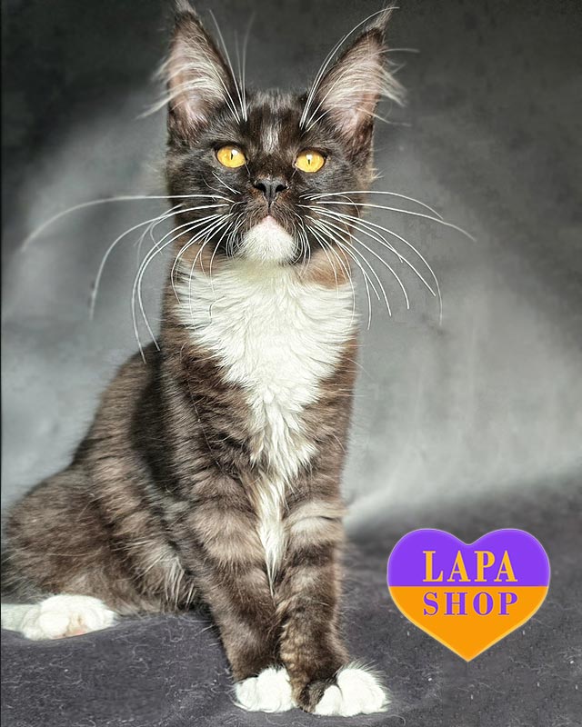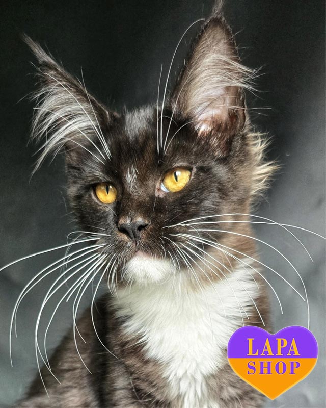 Omili – граційна кішечка породи мейн-кун із чорним димним забарвленням та білосніжними акцентами. Вона має м’яку, шовковисту шерсть і проникливий погляд, який одразу підкорює серце.
