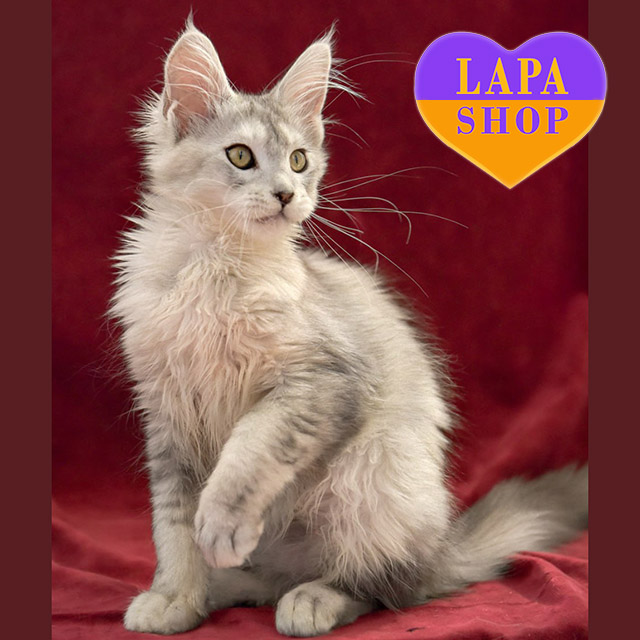 Rosalie — витончена мейн-кун дівчинка з чарівним черепаховим сріблястим тикованим забарвленням. Її унікальний малюнок і ніжні кольори роблять її справжньою красунею.