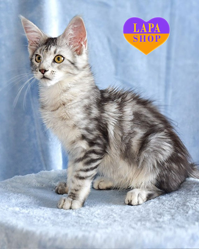 Ulina – мила красуня мейн-кун із розкішним чорним сріблястим мармуровим візерунком на шерсті.