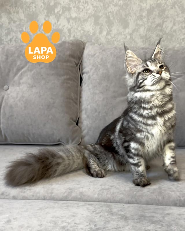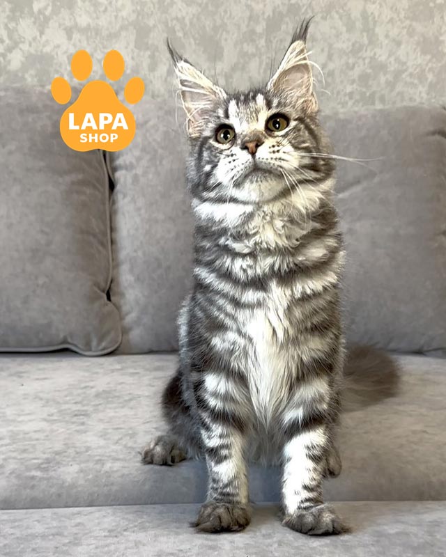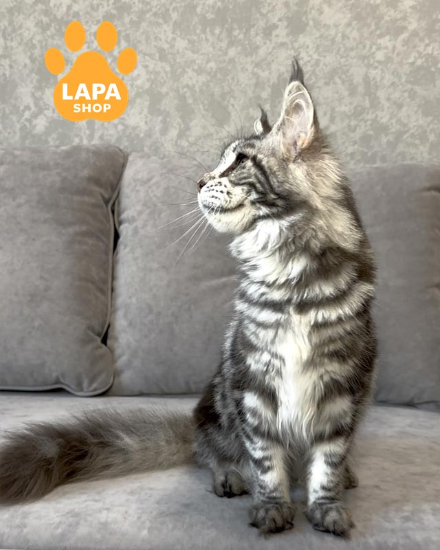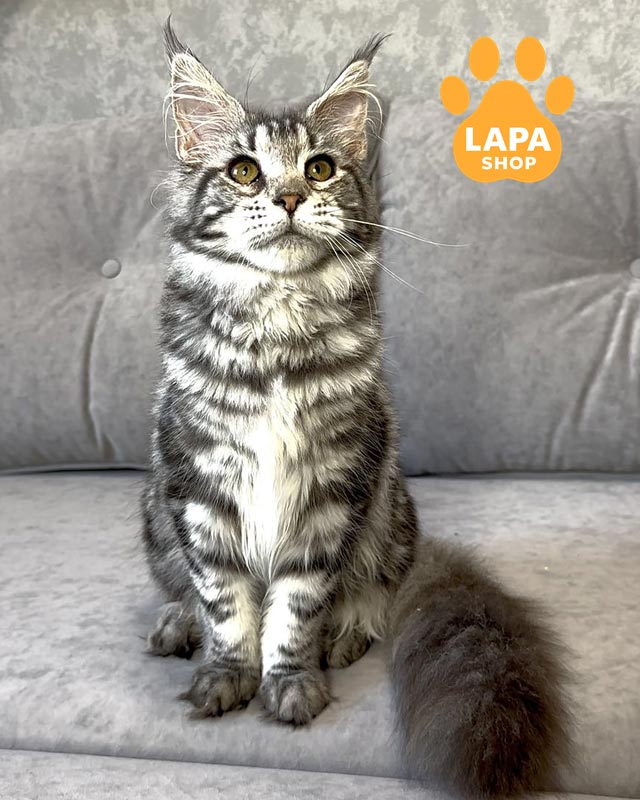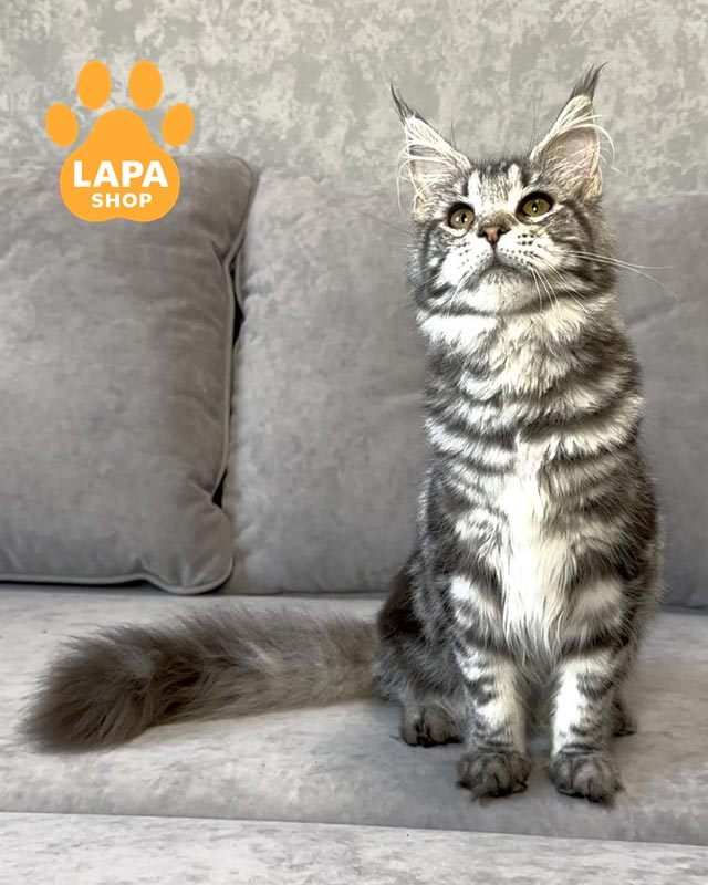 Велична красуня мейн-кун Princesses. Її густе сріблясте хутро з виразним малюнком нагадує справжній витвір мистецтва.