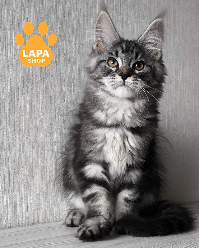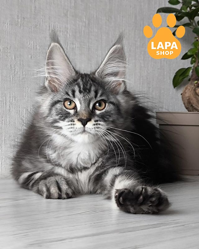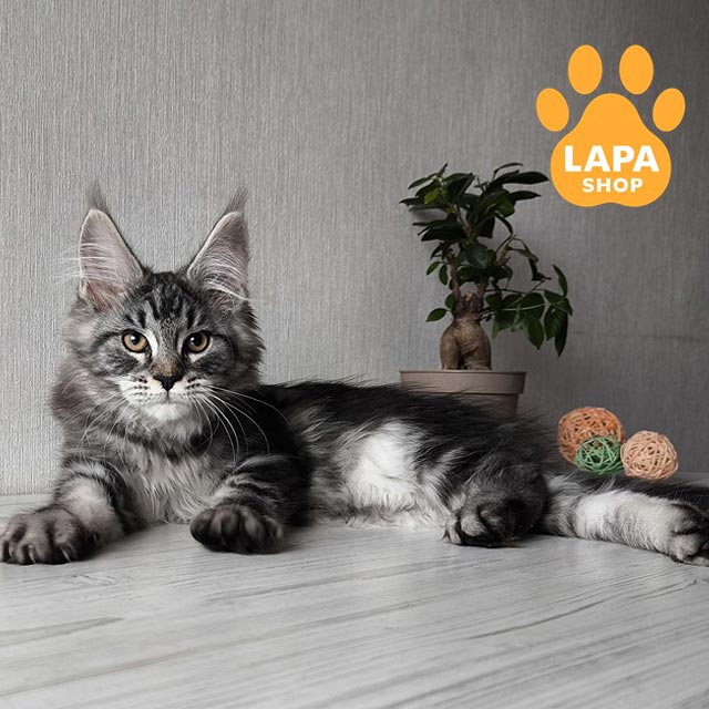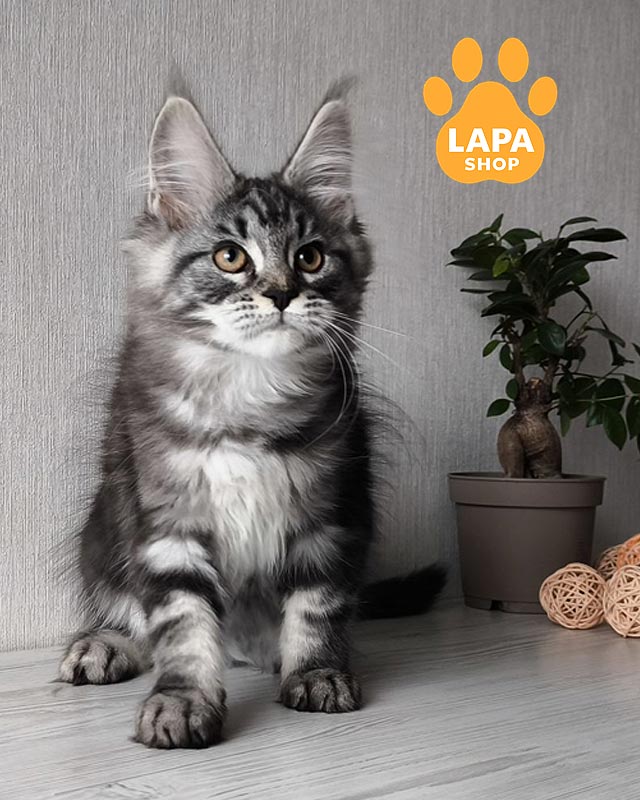 Lvory — сріблясто-мармурова красуня мейн-кун з розкішною шерстю, що переливається сріблястими відблисками.