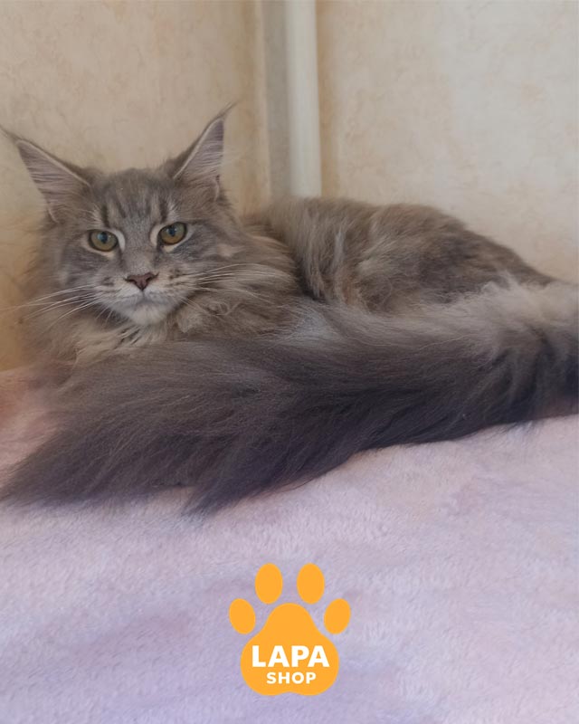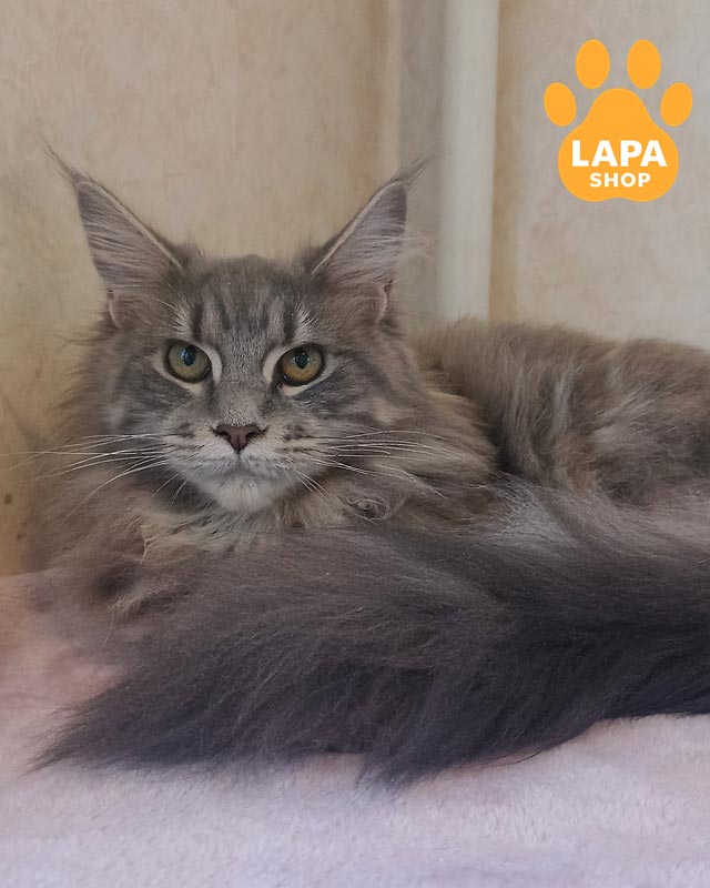 Yana — дівчинка породи мейн-кун з ефектним блакитно-черепаховим сріблястим мармуровим забарвленням (gs 22).