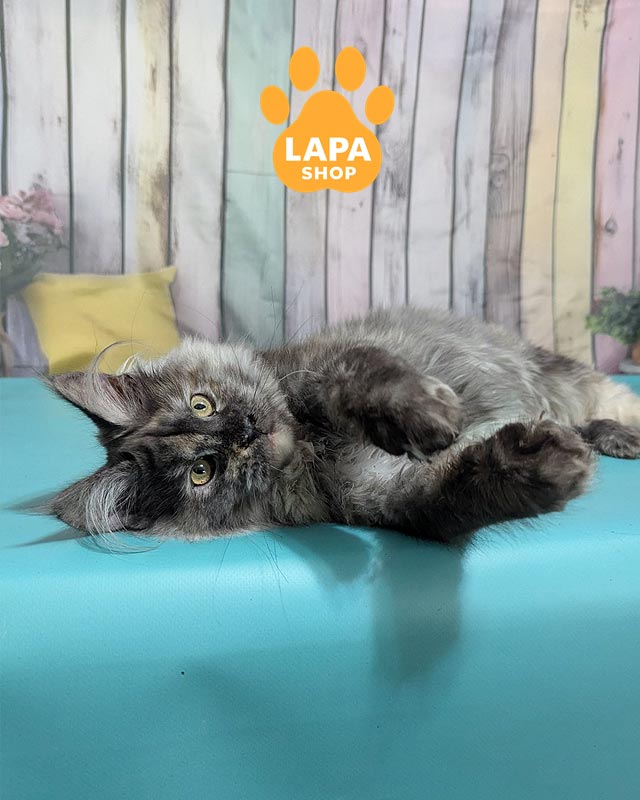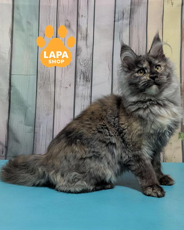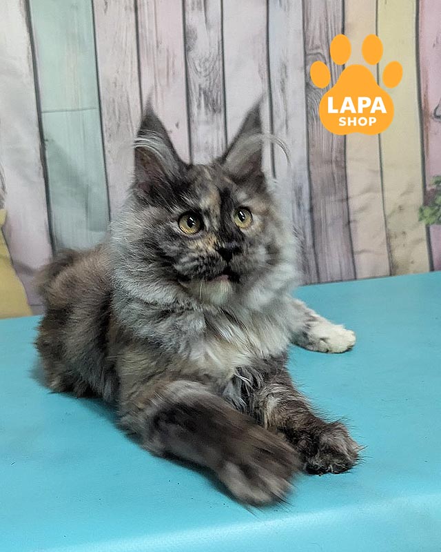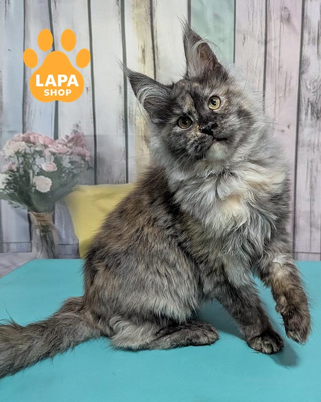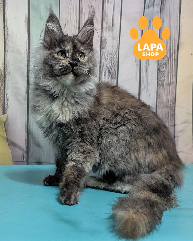 Зара — дівчинка породи мейн-кун з черепаховим димним забарвленням, де темна основа ефектно поєднується зі світлим сріблястим підшерстям.