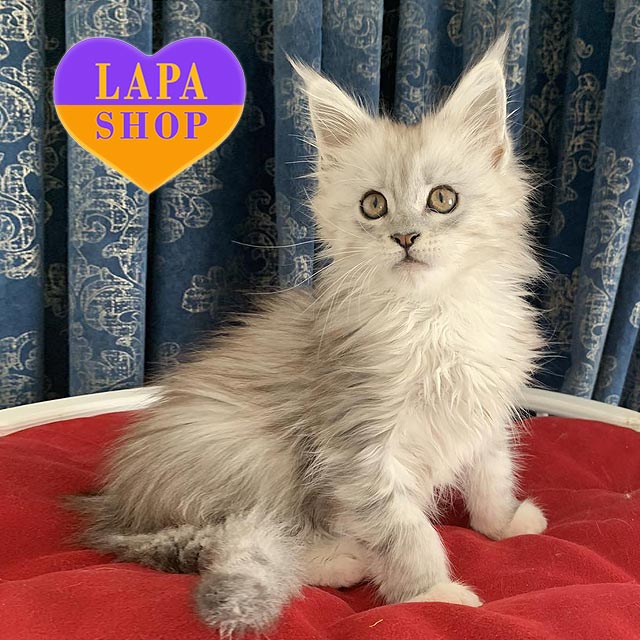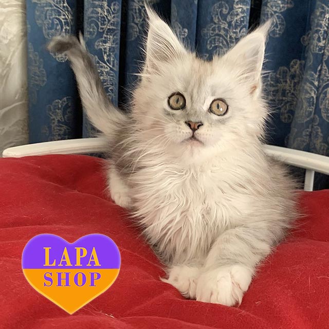 General – справжній красень породи мейн-кун із сріблястим затушованим з білим забарвленням. Його розкішна шубка переливається благородним сяйвом, а виразний погляд сповнений розуму та допитливості.