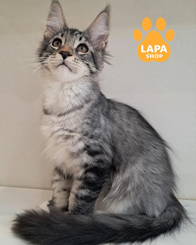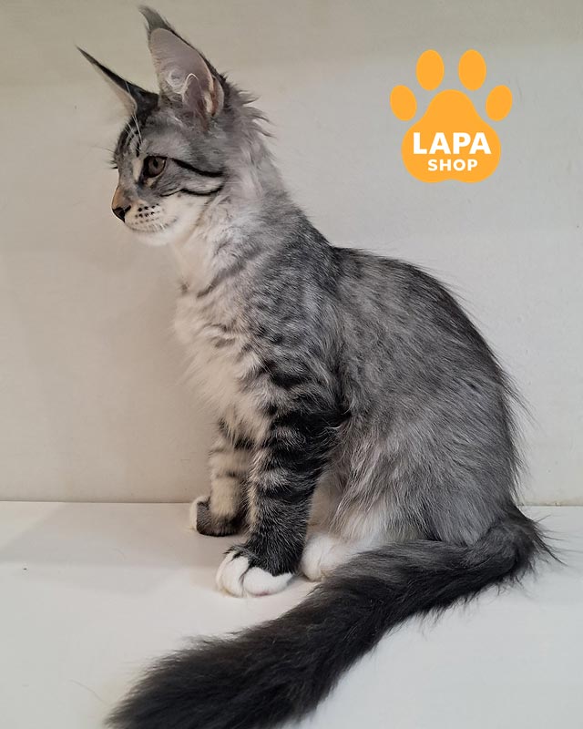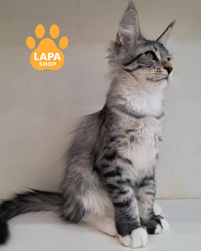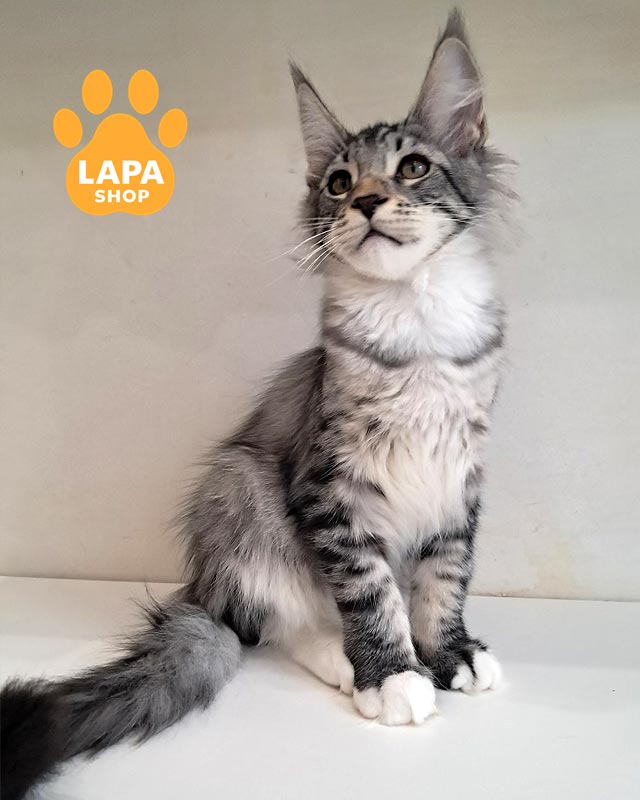 Джентльмен Dior — вишуканий мейн-кун у сріблястому вбранн, яке гармонійно поєднуєтья з білосніжними біколоровими акцентами.