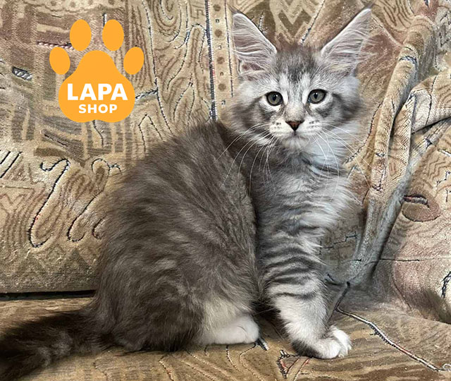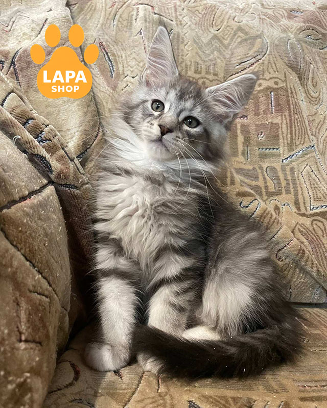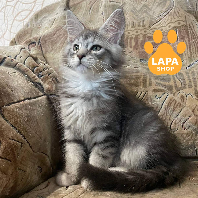 Dzhek — красивий красень породи мейн-кун з чорним сріблястим мармуровим забарвленням із білими вставками (ns 22 09). Його розкішна шерсть і пропорційна статура підкреслюють породну елегантність. Котик виглядає велично та привертає увагу своєю зовнішністю.