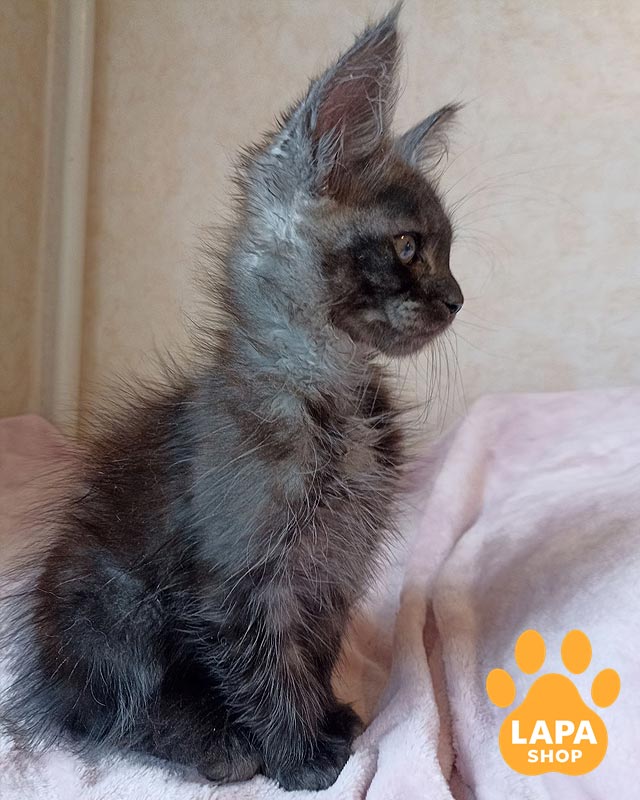 Zane — благородний мейн-кун із густою димчасто-чорною шерстю, що переливається сріблястими відтінками у світлі.