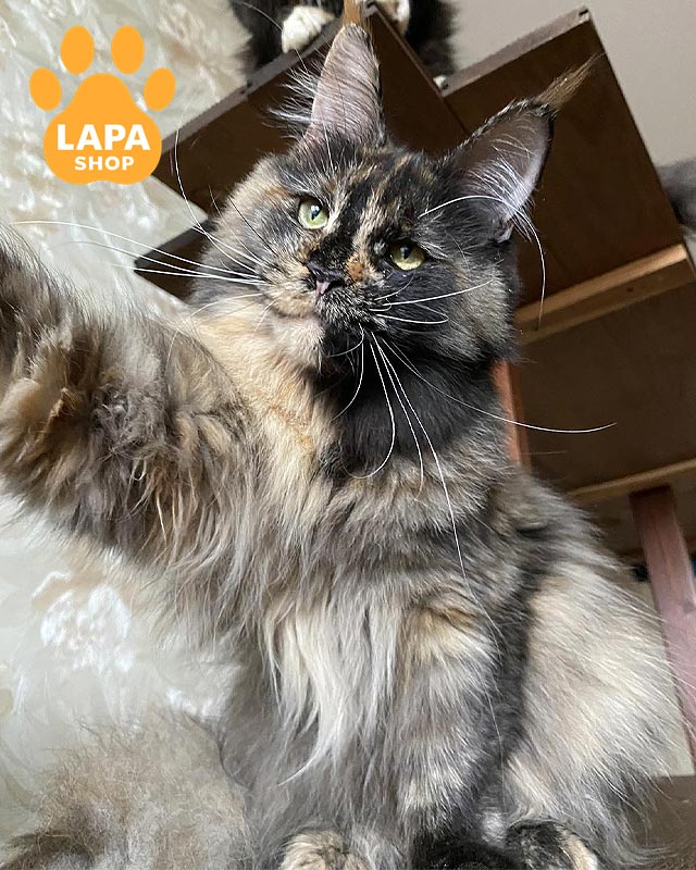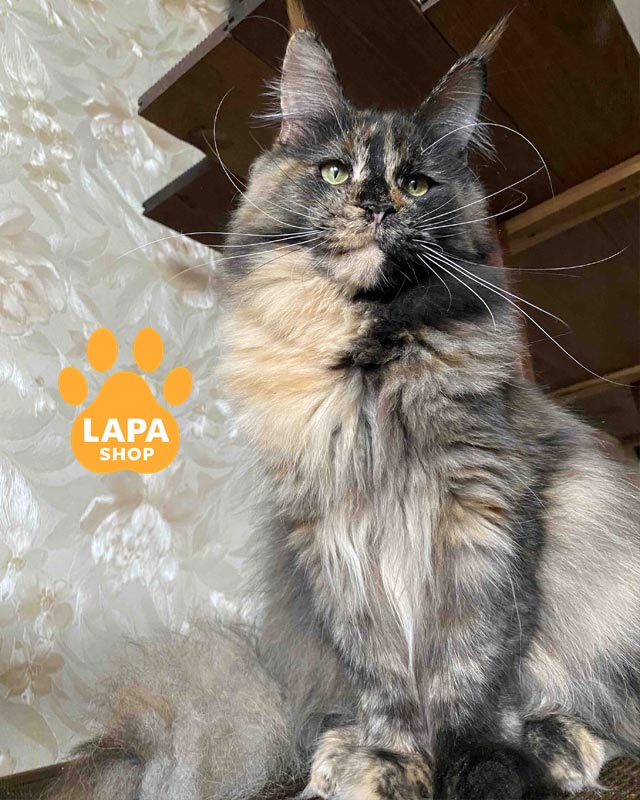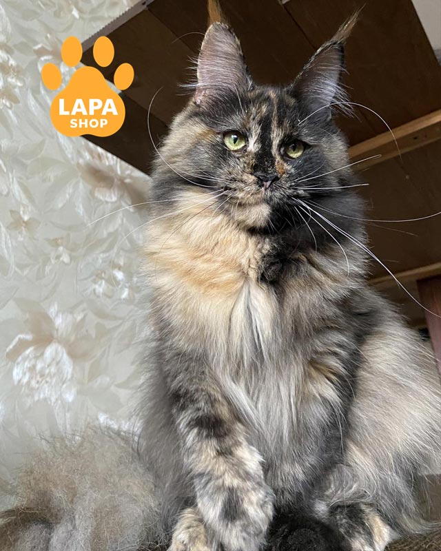 Hanna — витончена представниця породи мейн-кун із яскравим черепаховим забарвленням (f), яке надає їй унікальності та шарму.