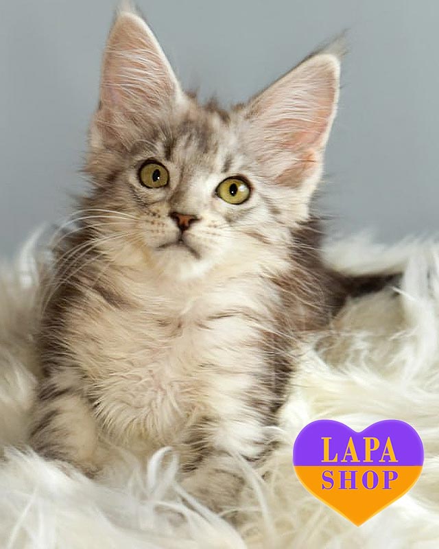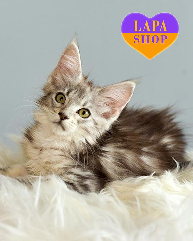 Uliana — елегантна мейн-кун дівчинка з вишуканим чорним сріблястим мармуровим забарвленням, яке переливається холодним блиском і створює ефект шляхетної шубки.