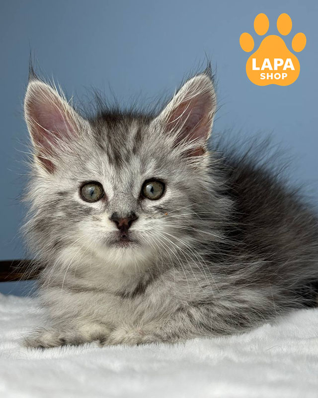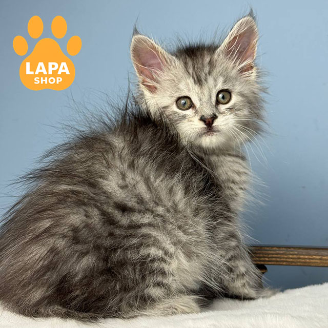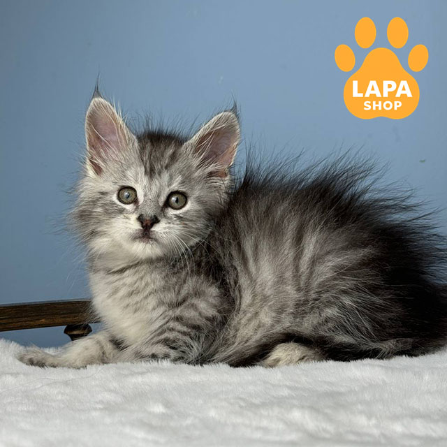 Ця гарна кішечка породи мейн-кун з чорним сріблястим плямистим забарвленням (ns 24), яке надає її густій шерсті виразного та благородного вигляду.