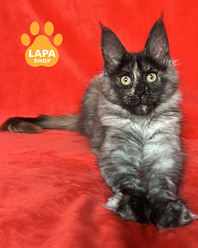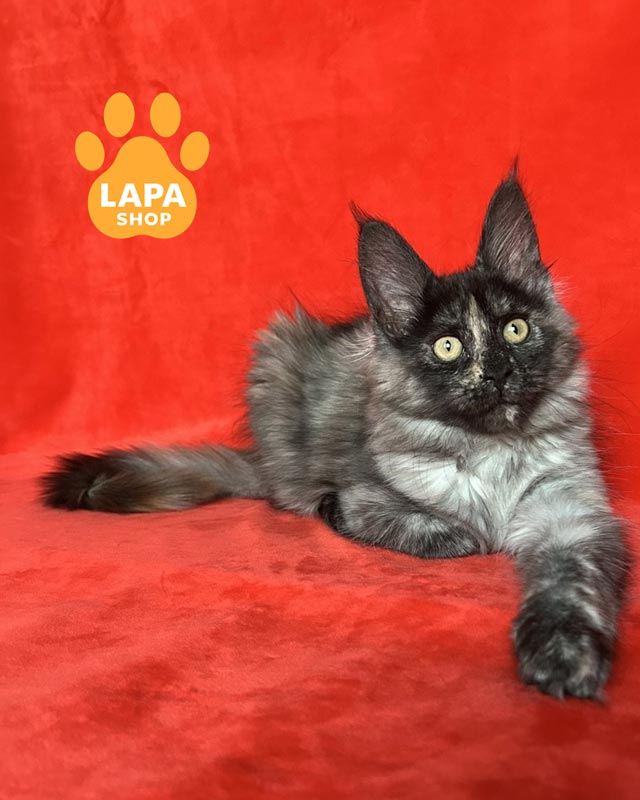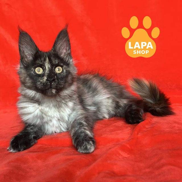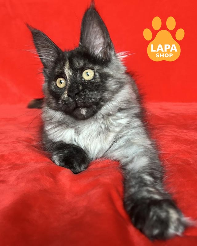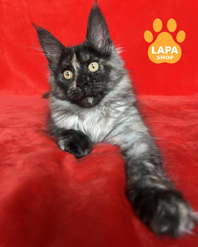 Liviya — елегантна кішечка з гармонійним черепаховим сріблястим забарвленням, яке створює унікальний та вишуканий малюнок на її шерсті. Її благородний тип, виразні риси мордочки та м’які переливи кольорів роблять зовнішність по-справжньому особливою. Пухнасті вушка та граційна статура підкреслюють справжню красу юної мейн-кун леді.