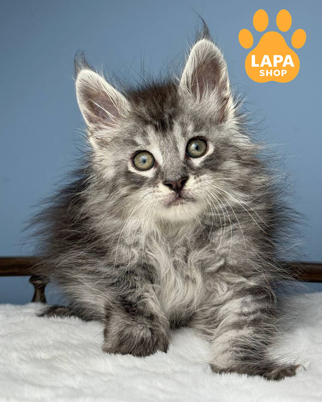 Цей гарний котиук породи мейн кун з чорним сріблястим плямистим забарвленням (ns 24), яке надає його густій шерсті виразного і благородного вигляду.