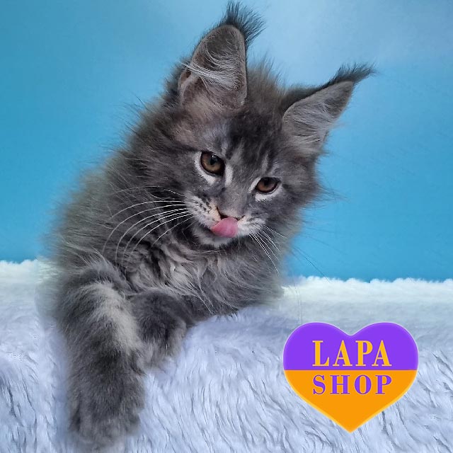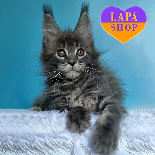 Zhanetta – неймовірна красуня мейн-кун, яка зачаровує своїм розкішним блакитним мармуровим забарвленням і граційною поставою.
