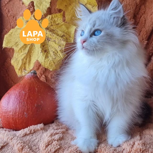 Його шовковиста шубка кольору «блю лінкс пойнт з білим» м’яко відтіняє яскраві блакитні очі, надаючи образу гармонії та витонченості.