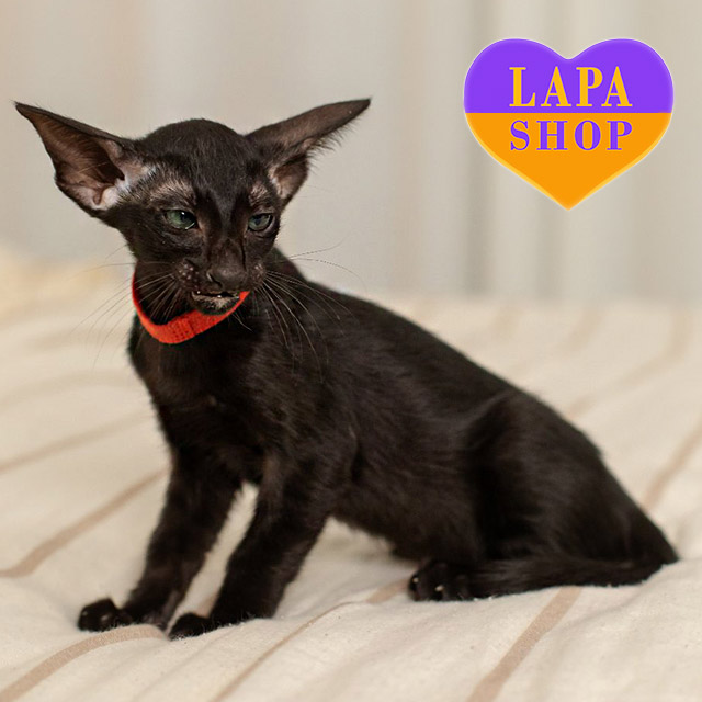 Ця витончена представниця породи орієнтал із розкішним чорним забарвленням. Її стрункий силует і довгі витончені лінії підкреслюють вишукану екзотику східного типу. Чистий насичений колір робить її образ надзвичайно стильним і виразним.