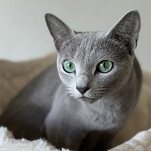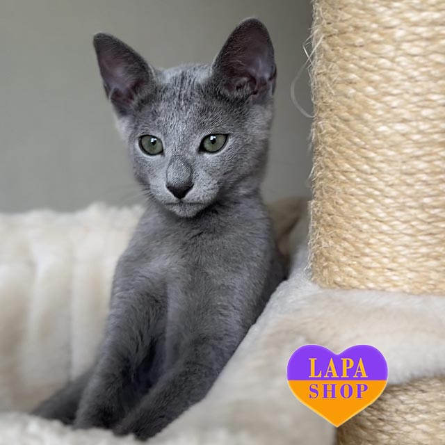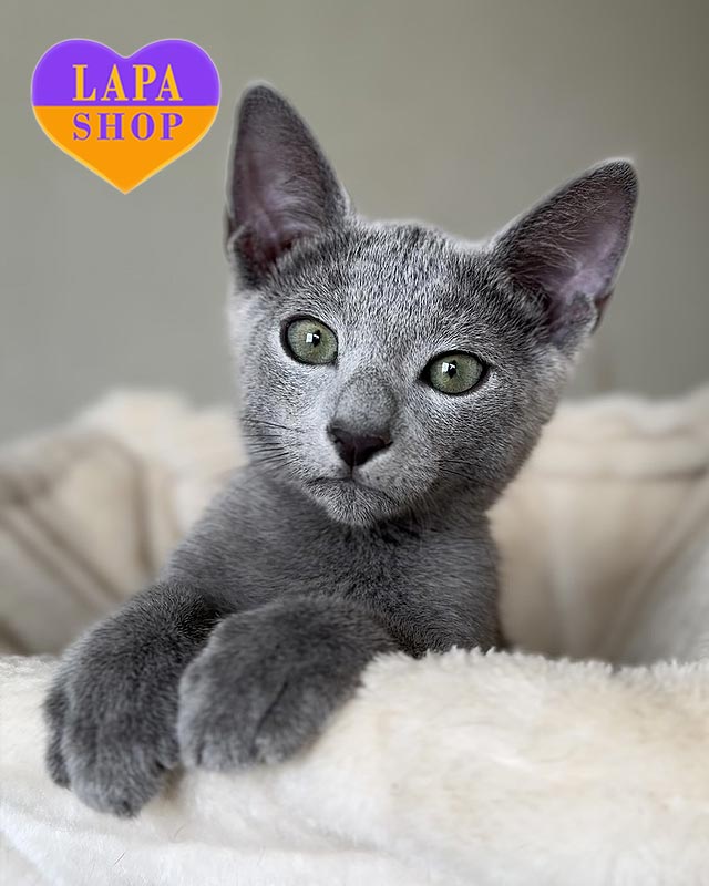 Його шовковиста блакитна шерсть із легким сріблястим відтінком переливається на світлі, а зеленкуваті очі надають погляду особливої глибини.