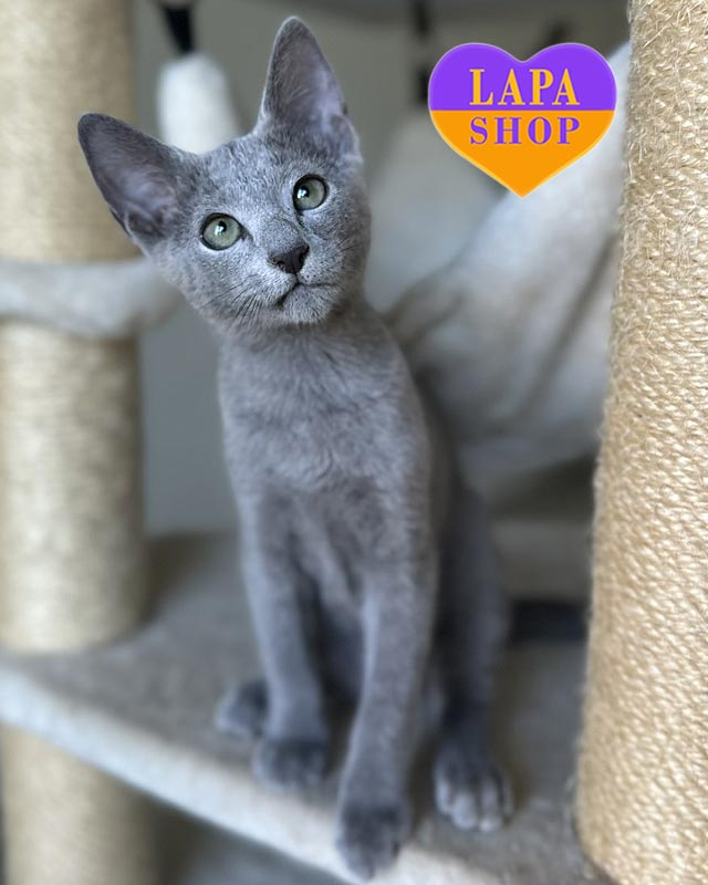 Російське блакитне кошеня у пошуку люблячих батьків.