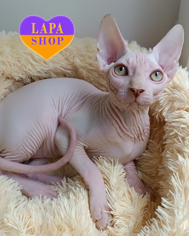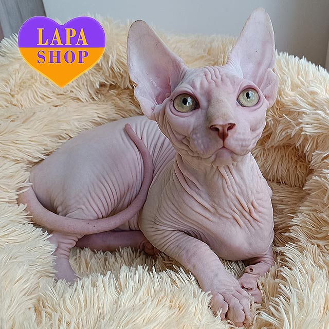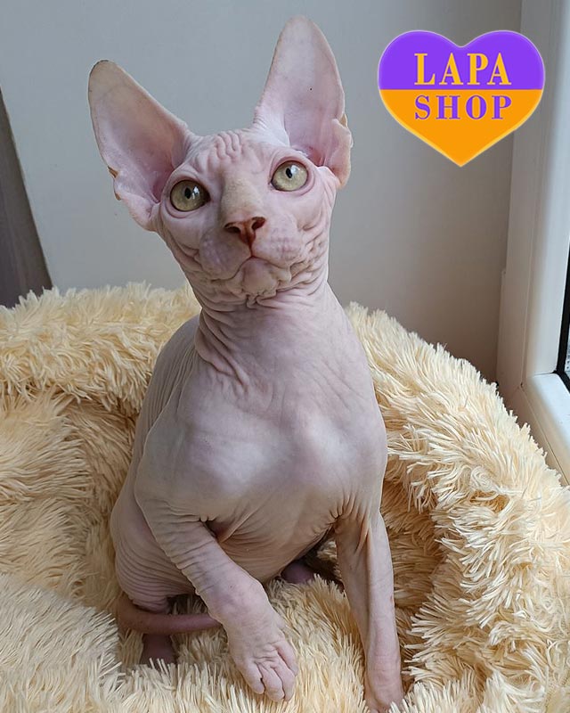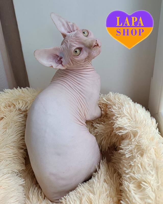 Елегантний хлопчик з оксамитовою шкірою білого кольору та виразними жовтими очима. Його контрастна зовнішність надає образу витонченості та унікальності. Гармонійна статура й класичні риси породи роблять його справжнім представником канадських сфінксів.