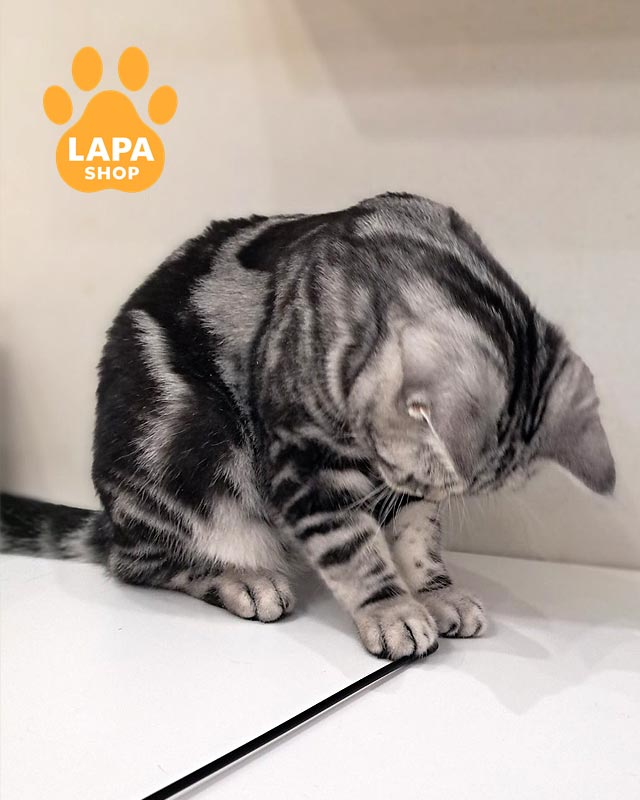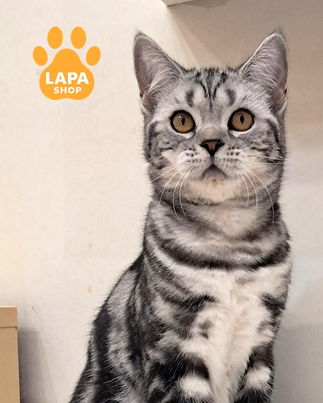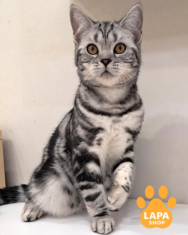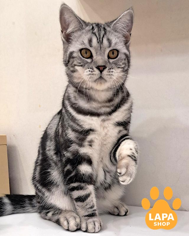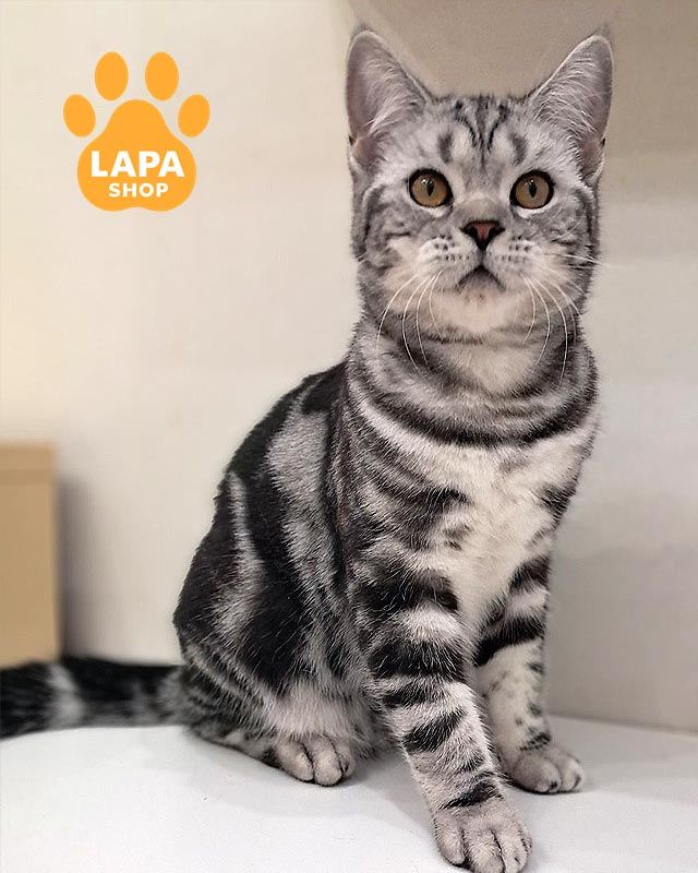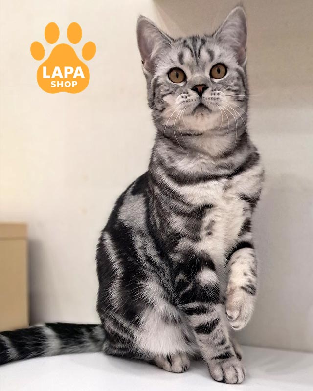 Лотос — елегантний котик із прямими вушками та розкішним сріблястим хутром, прикрашеним глибоким чорним мармуровим малюнком.