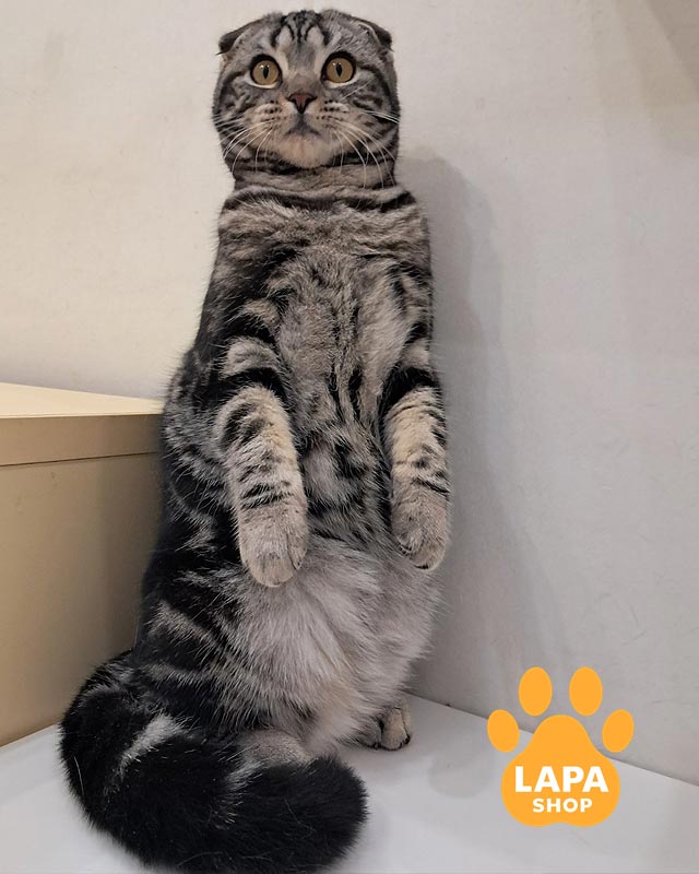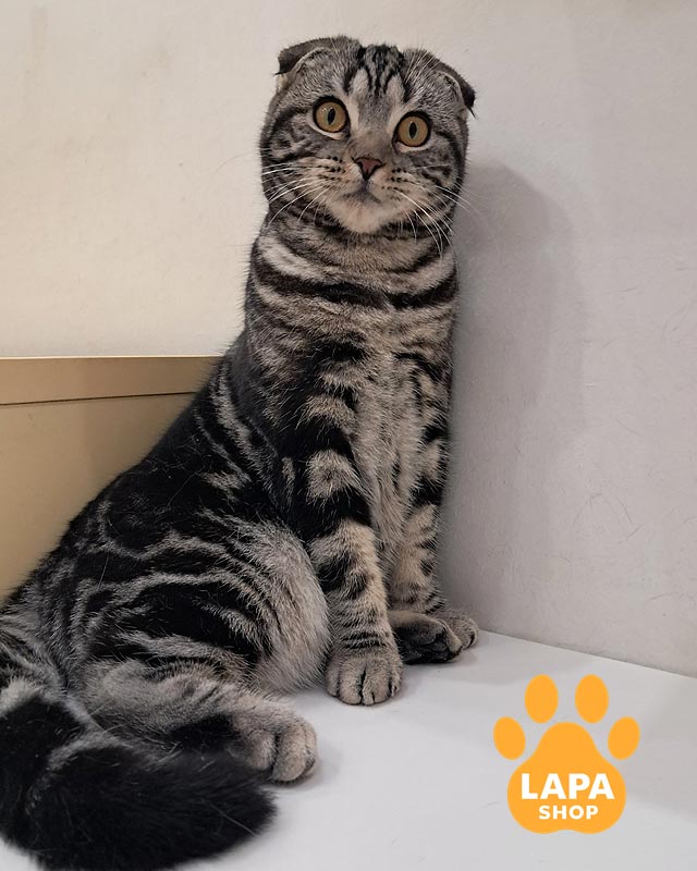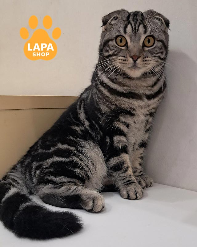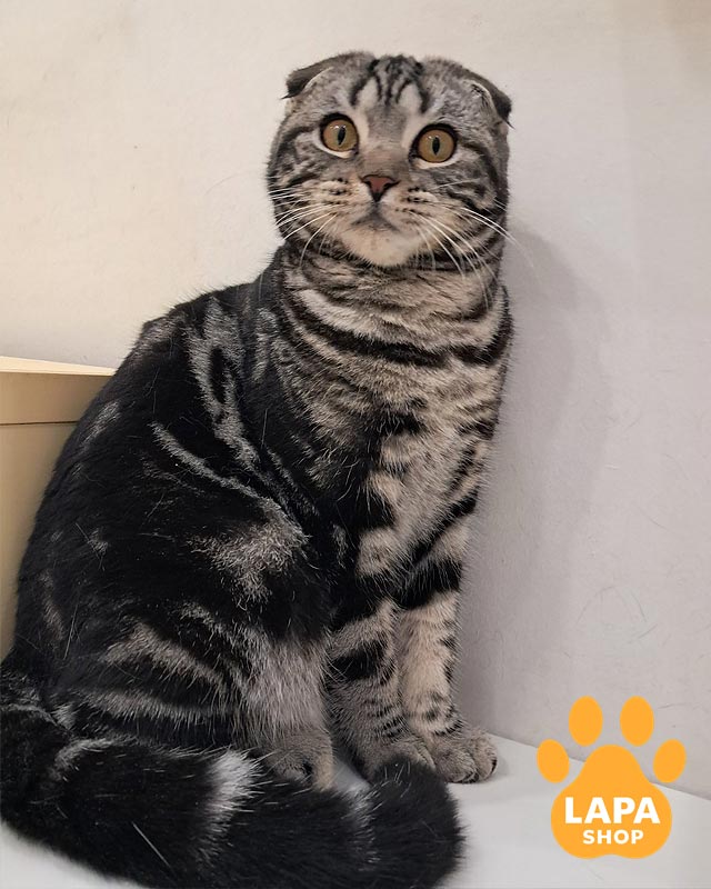 Елегантна дівчинка скотіш-фолд Урсула. Вона має насичене забарвлення, що створює на її шерсті контрастний візерунок і підкреслює шляхетний вигляд.