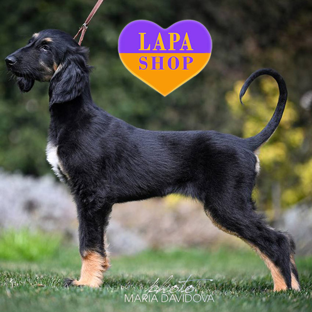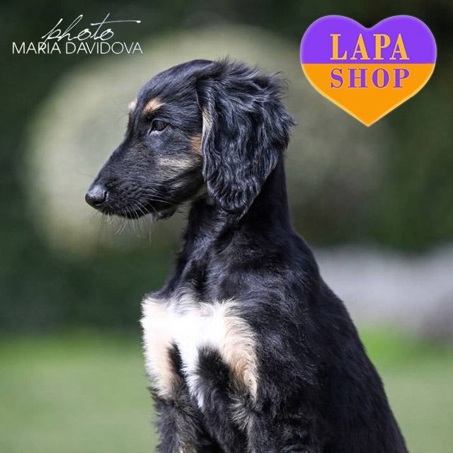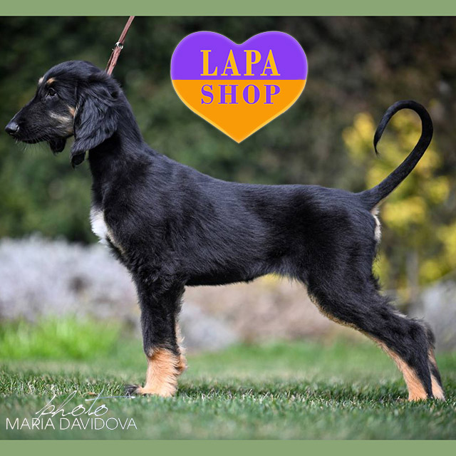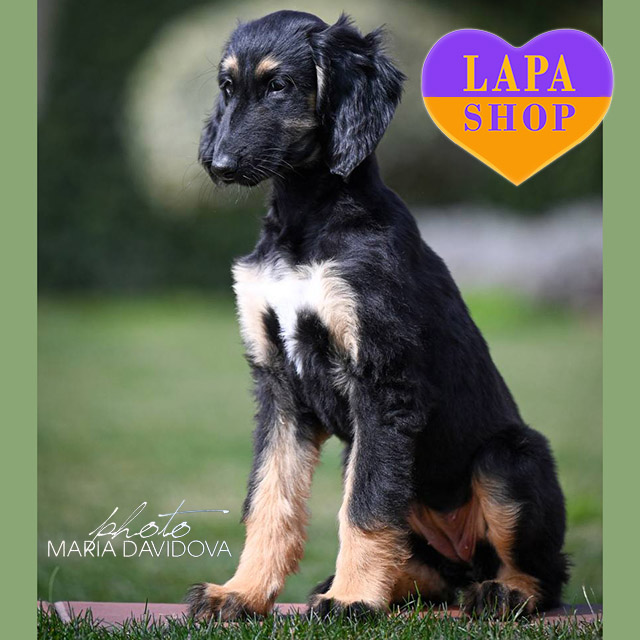 Ця вишукана дівчинка породи афганська борза зачаровує своїм довгим шовковистим хутром та контрастним чорним триколорним забарвленням. Її елегантні лінії, гордовита постава та виразний погляд підкреслюють шляхетність породи. Вона створена, аби бути в центрі уваги та захоплень.