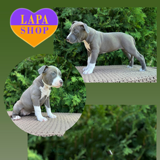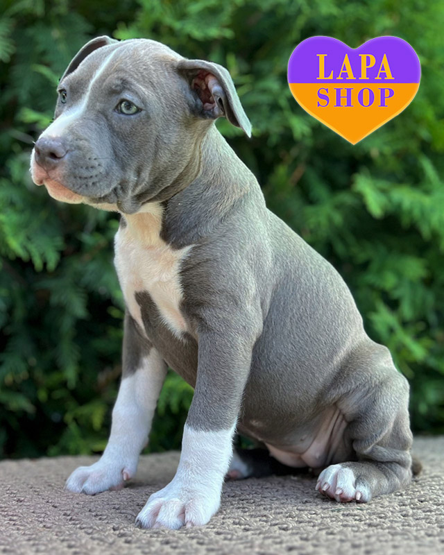 Ця неймовірно красива дівчинка породи американський стаффордширський терʼєр з рідкісним блакитним забарвленням у поєднанні з білим. Її сильна статура, врівноважені пропорції та виразна мордочка чудово демонструють якість породи.