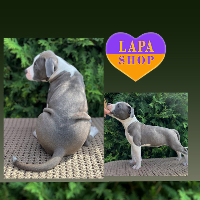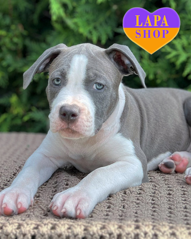 Ця неймовірно красива дівчинка породи американський стаффордширський терʼєр з рідкісним блакитним забарвленням у поєднанні з білим. Її сильна статура, врівноважені пропорції та виразна мордочка чудово демонструють якість породи.