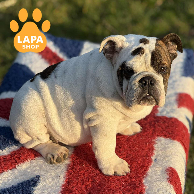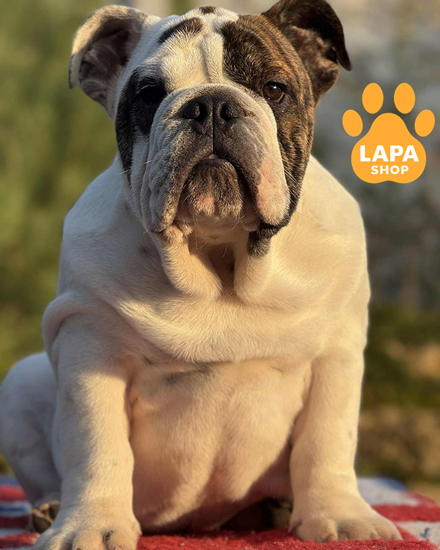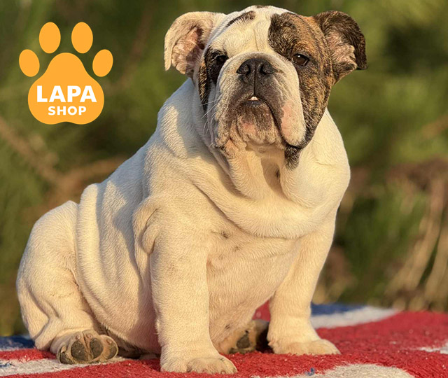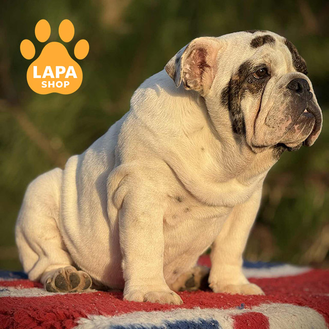 Цей милий хлопчик породи англійський бульдог із рідкісним білим забарвленням, прикрашеним тигрово-рудими плямами. Контрастний малюнок робить його зовнішність неповторною та виразною. Потужна статура та гармонійні риси роблять його справжнім представником своєї породи.