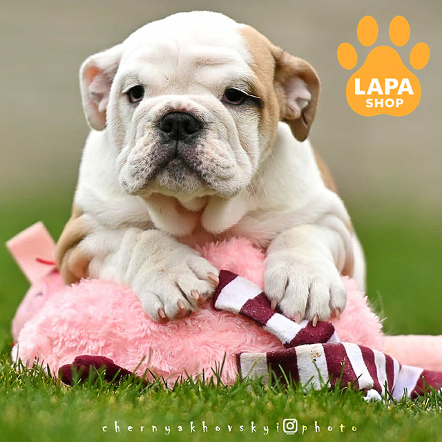 Мила дівчинка англійського бульдога з яскравим рудим забарвленням і акуратними білими відмітинами. Її характерна бульдожача мордочка й гармонійна статура роблять зовнішність особливо привабливою та дуже породною. Вона має ніжний, доброзичливий темперамент і чудово підійде для сім’ї.