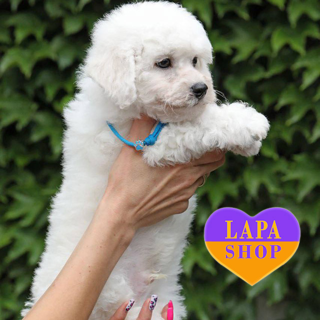 Чарівний хлопчик породи бішон фрізе вразить вас сніжно-білим, пухнастим хутром і ніжною зовнішністю. Його кругла мордочка, виразні очі та гармонійна статура створюють образ справжнього аристократа. Завдяки густій та м’якій шерсті він виглядає як живе біле хмаринка.