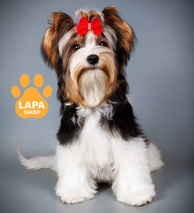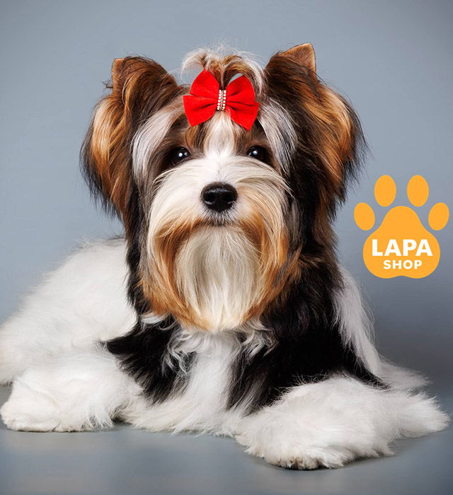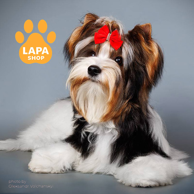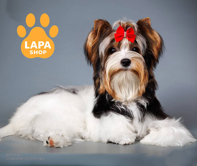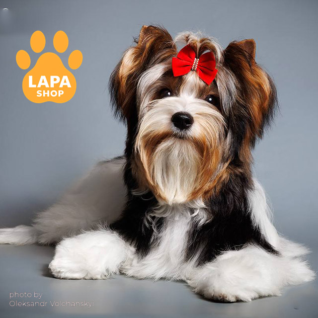 Чарівна дівчинка породи бівер-йоркширський тер’єр із розкішним поєднанням білого, чорного та золотого забарвлення. Її шовковиста шерсть і витончена зовнішність надають їй неповторного шарму.