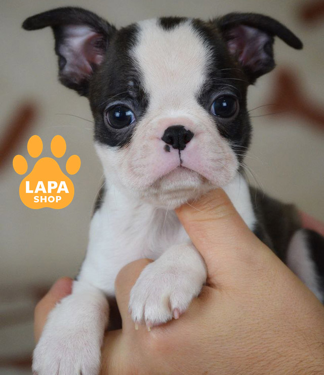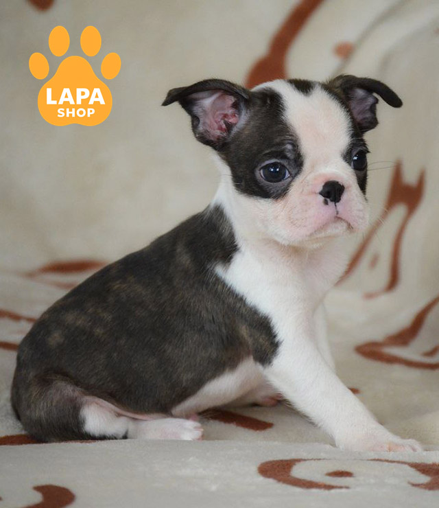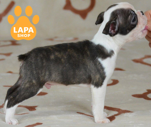 Цей чарівний хлопчик породи бостон тер’єр має чорнотигрове забарвлення з білими відмітинами, що надає йому стильного та витонченого вигляду. Його компактна статура та виразна мордочка створюють неповторний образ справжнього джентльмена. Він виглядає гармонійно та впевнено, одразу привертаючи увагу своєю елегантністю.