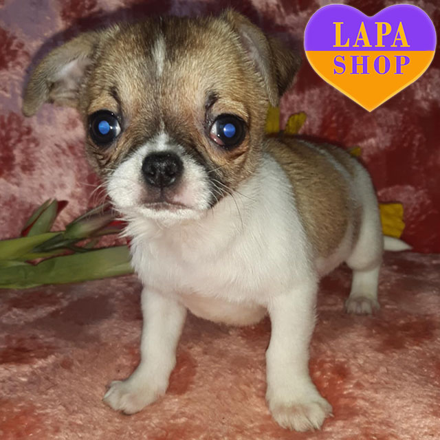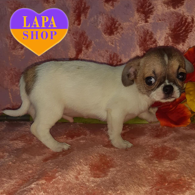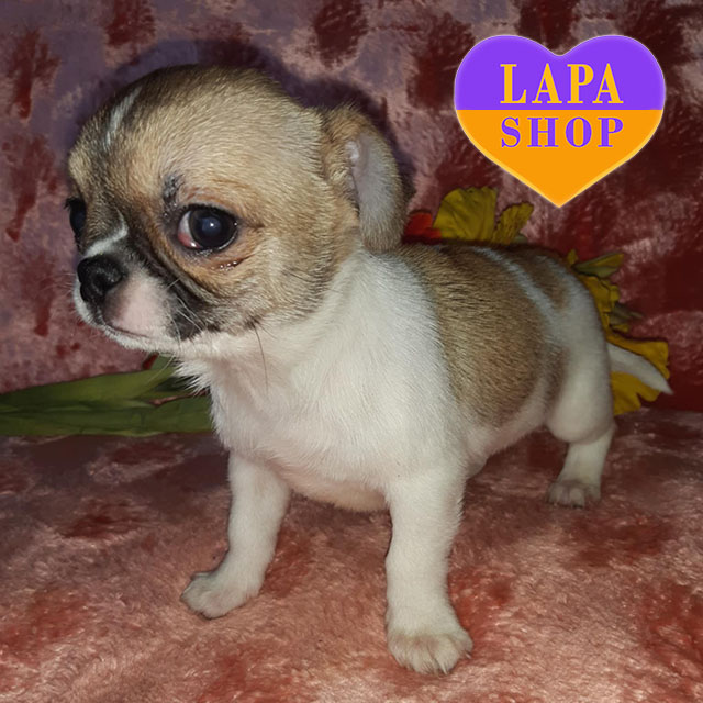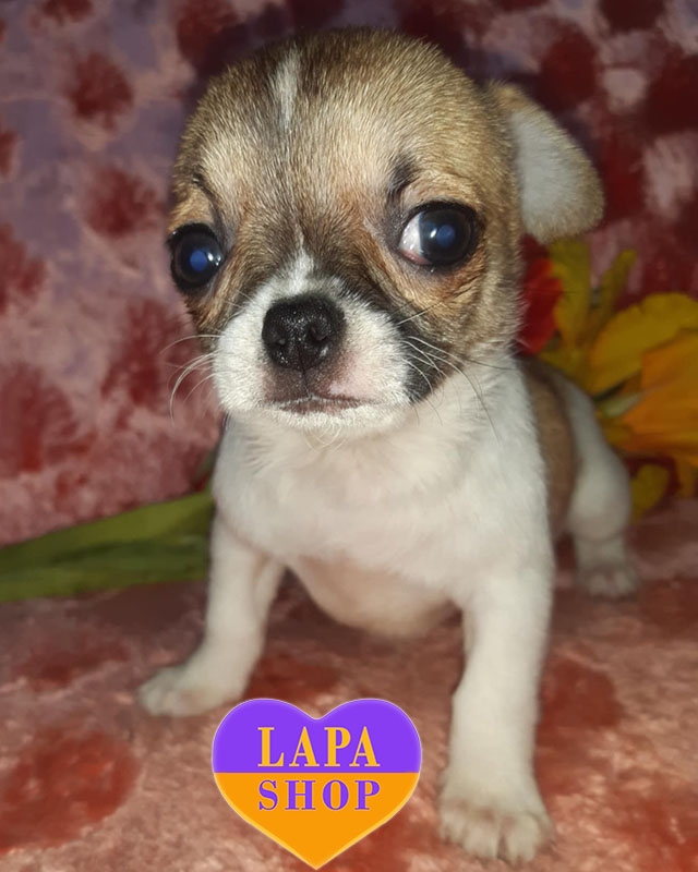 Цей маленький хлопчик породи чихуахуа має яскраве біло-руде забарвлення, яке надає йому особливого шарму. Акуратна мордочка, компактна статура та коротенька гладка шерсть роблять його справжнім мініатюрним джентльменом.