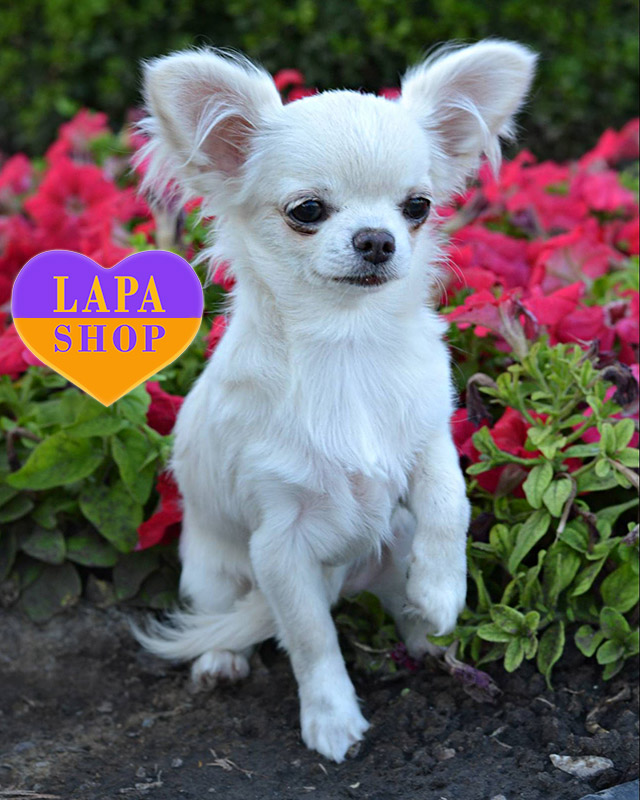 Мила дівчинка чихуахуа з ніжним кремовим забарвленням привертає увагу витонченими рисами та компактною статурою. Її пухнаста шубка та великі виразні очі надають зовнішності особливого шарму. Невеликий розмір робить її ідеальною для життя як у квартирі, так і в заміському будинку.